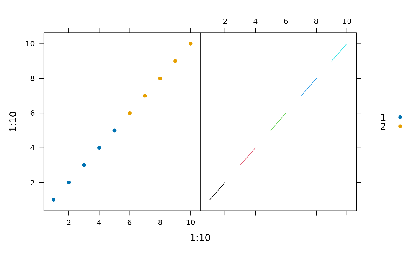 xyplot(1:10 ~ 1:10, groups = factor(rep(1:2, each = 5)),