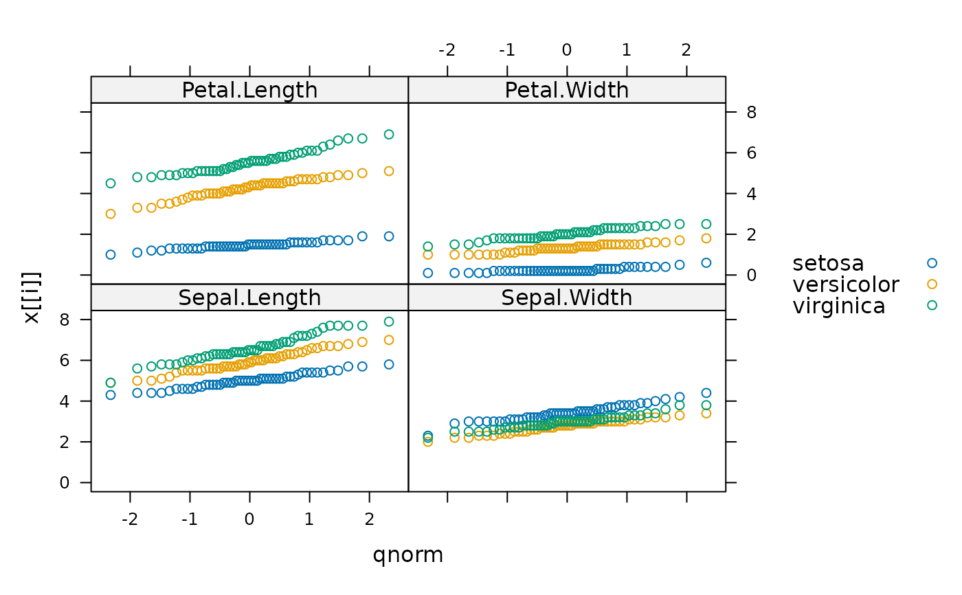 xyplot.list(iris[1:4], FUN = qqmath, groups = iris$Species,