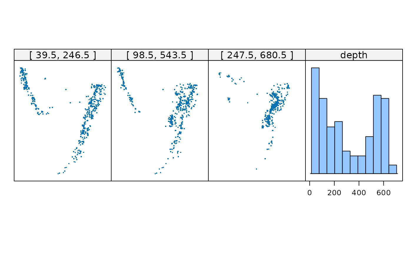 qua <- c(qua, depth = histogram(quakes$depth), layout = c(4, 1))