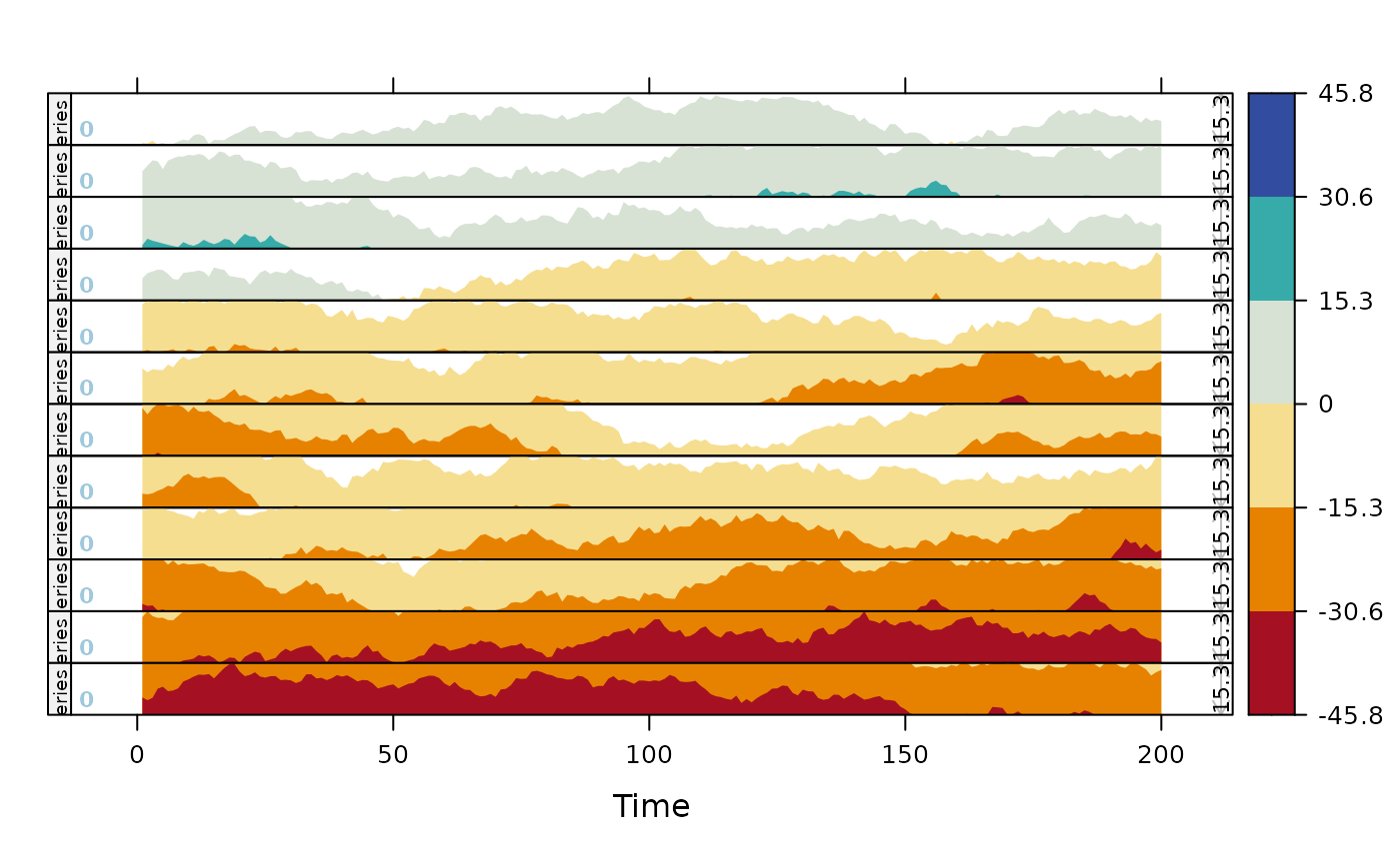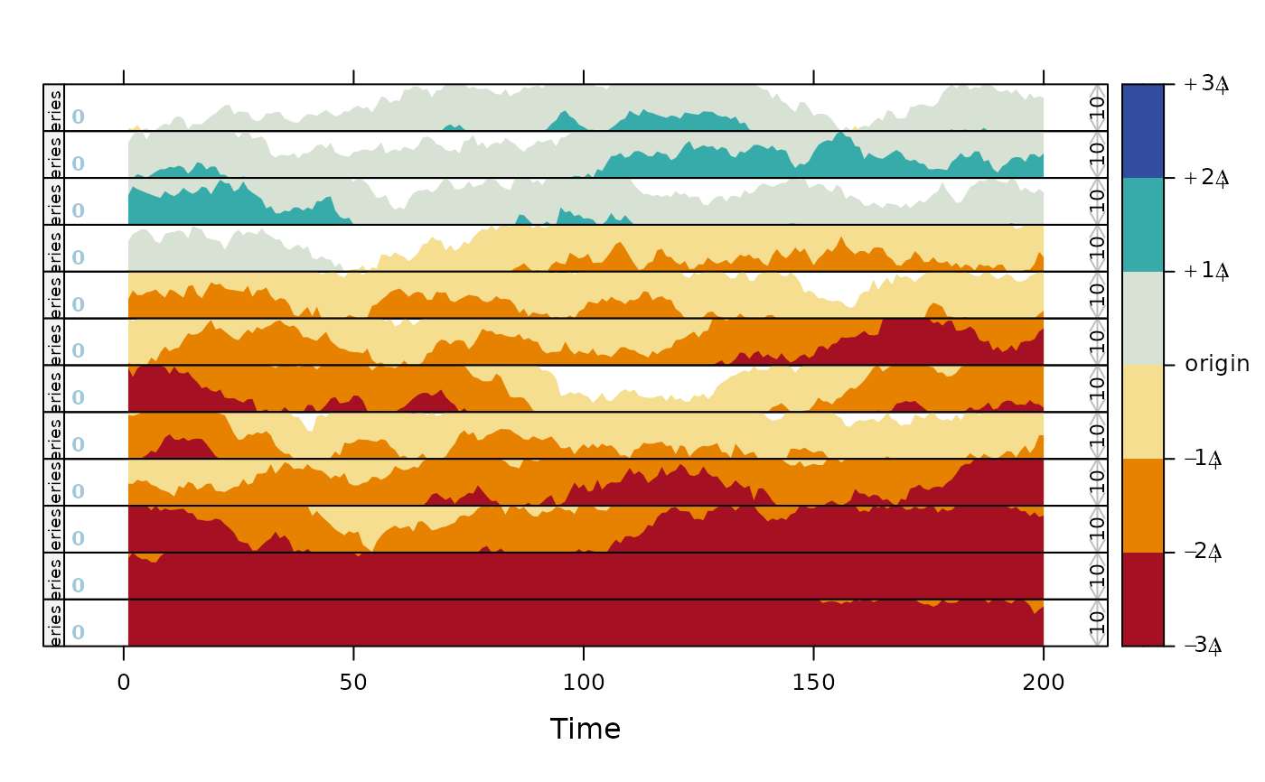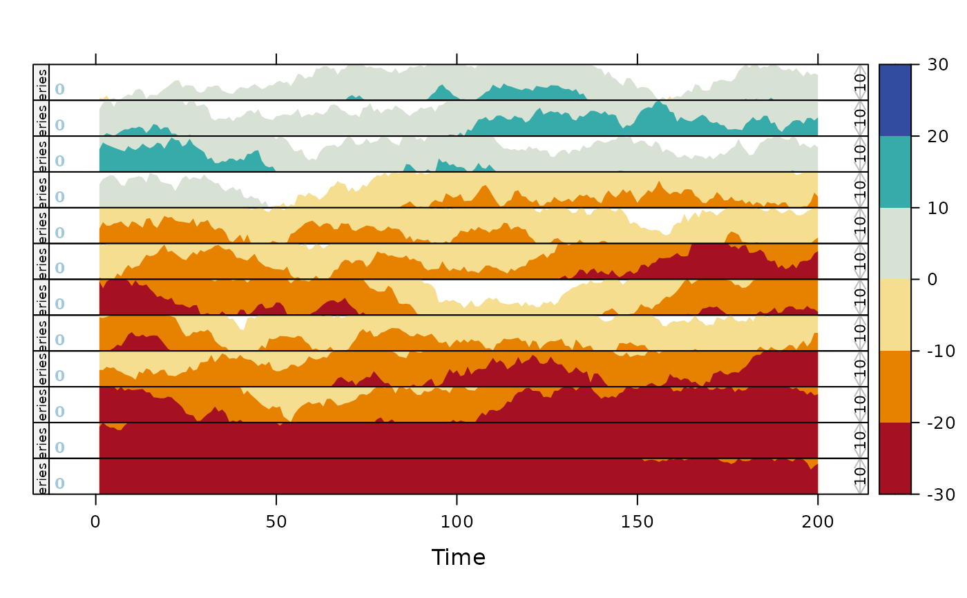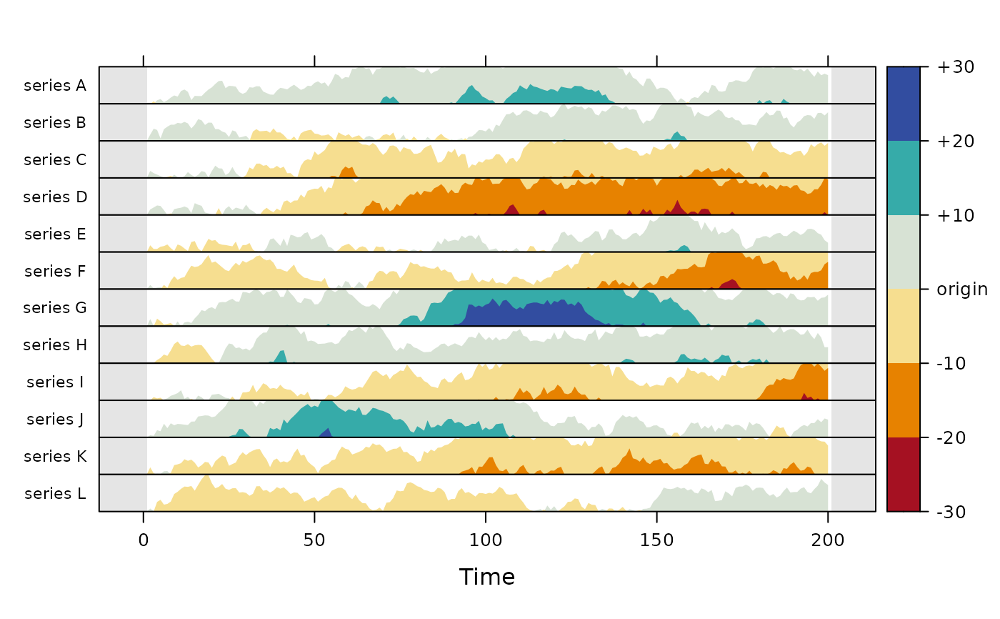 horizonplot.RdPlot many time series in parallel by cutting the y range into segments and overplotting them with color representing the magnitude and direction of deviation.
