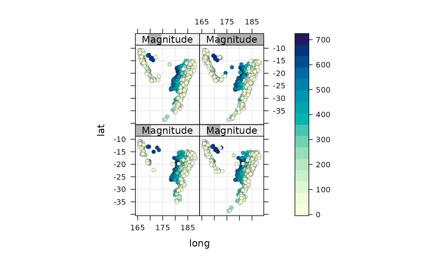 levelplot(depth ~ long + lat | Magnitude, data = quakes.ordered,