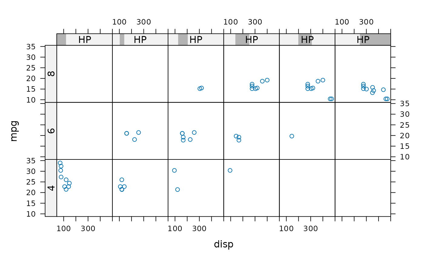 useOuterStrips(xyplot(mpg ~ disp | factor(cyl) + HP, mtcars),