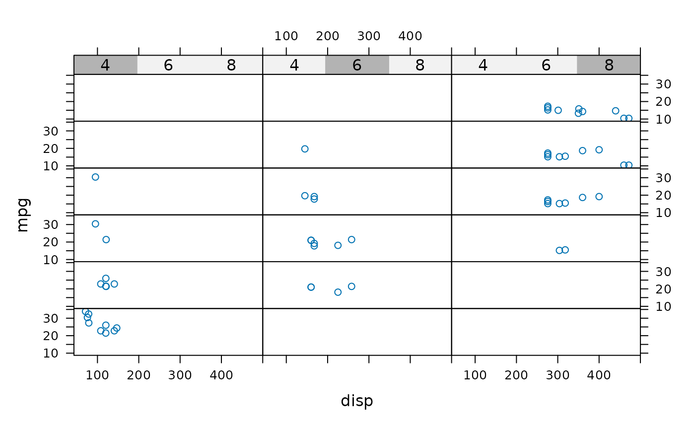 useOuterStrips(xyplot(mpg ~ disp | HP + factor(cyl), mtcars))