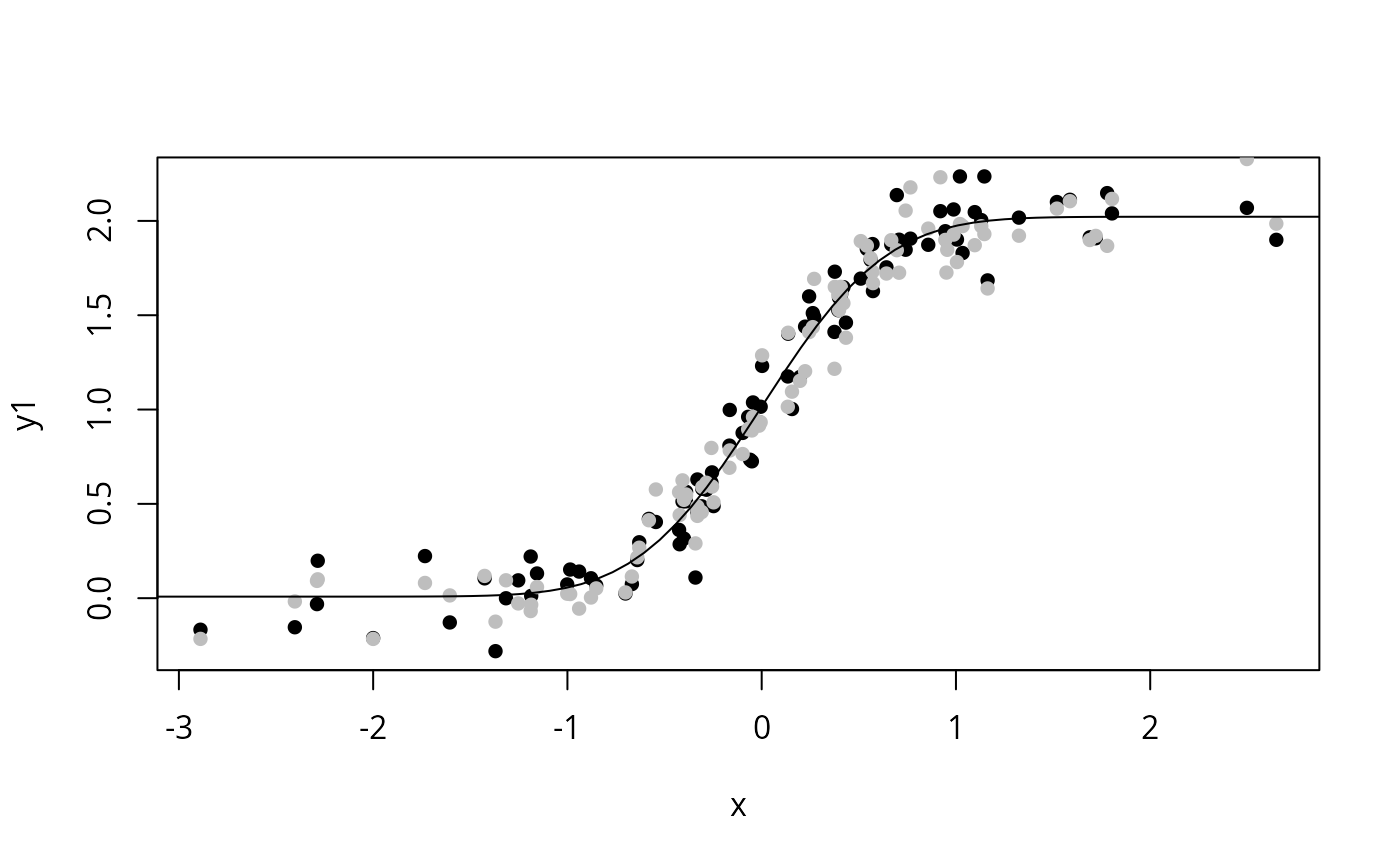 plot(y1~x,d,pch=16); points(y2~x,d,pch=16,col="gray")