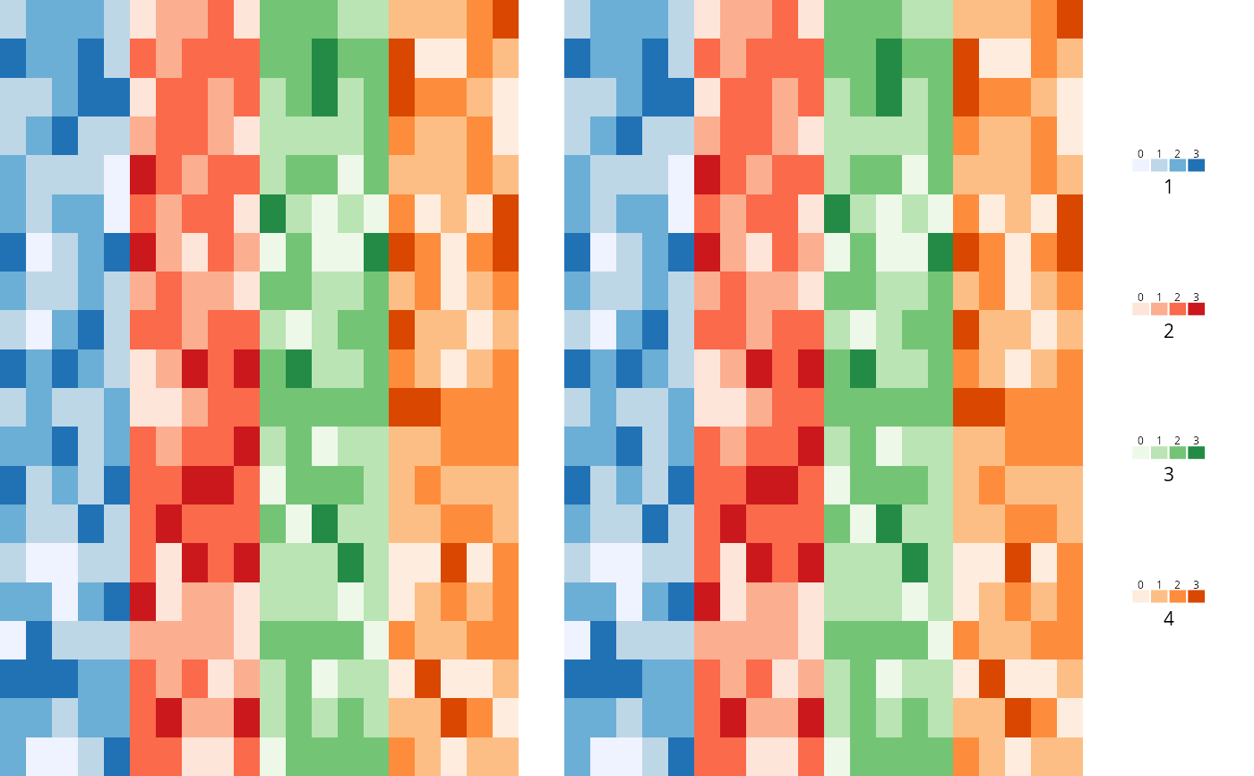 col = list(c("#EFF3FF", "#BDD7E7", "#6BAED6", "#2171B5"), c("#FEE5D9", "#FCAE91",
