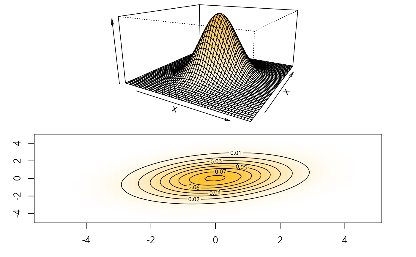surface(function(x) dmvn0(x,sigma=diag(2)),c(-3,3),lit=FALSE,smooth=FALSE,box=FALSE,alpha=0.8)