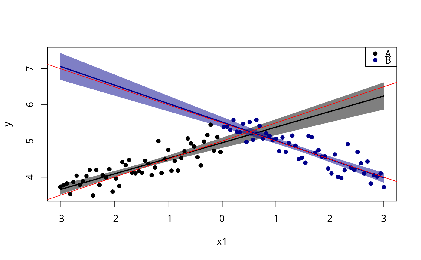 y <- 5 + 2*x0 + 0.5*x1 + -1*(x2=="B")*x1 + 0.5*(x2=="B") + rnorm(n, sd=0.25)