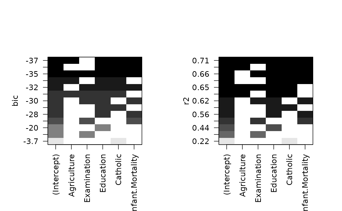 plot(x, labels=obj$xnames, main=NULL, scale=c("bic", "Cp", "adjr2", "r2"),