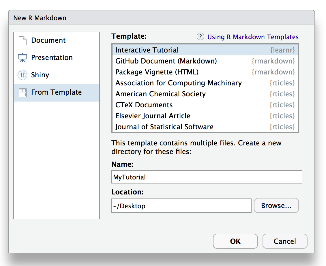 Note that tutorials aren’t just the Rmd source file, rather they are directories that contain the Rmd source file as well as other supporting files (e.g. figures and other images). As a result the default behavior is to create new tutorials within their own directory.