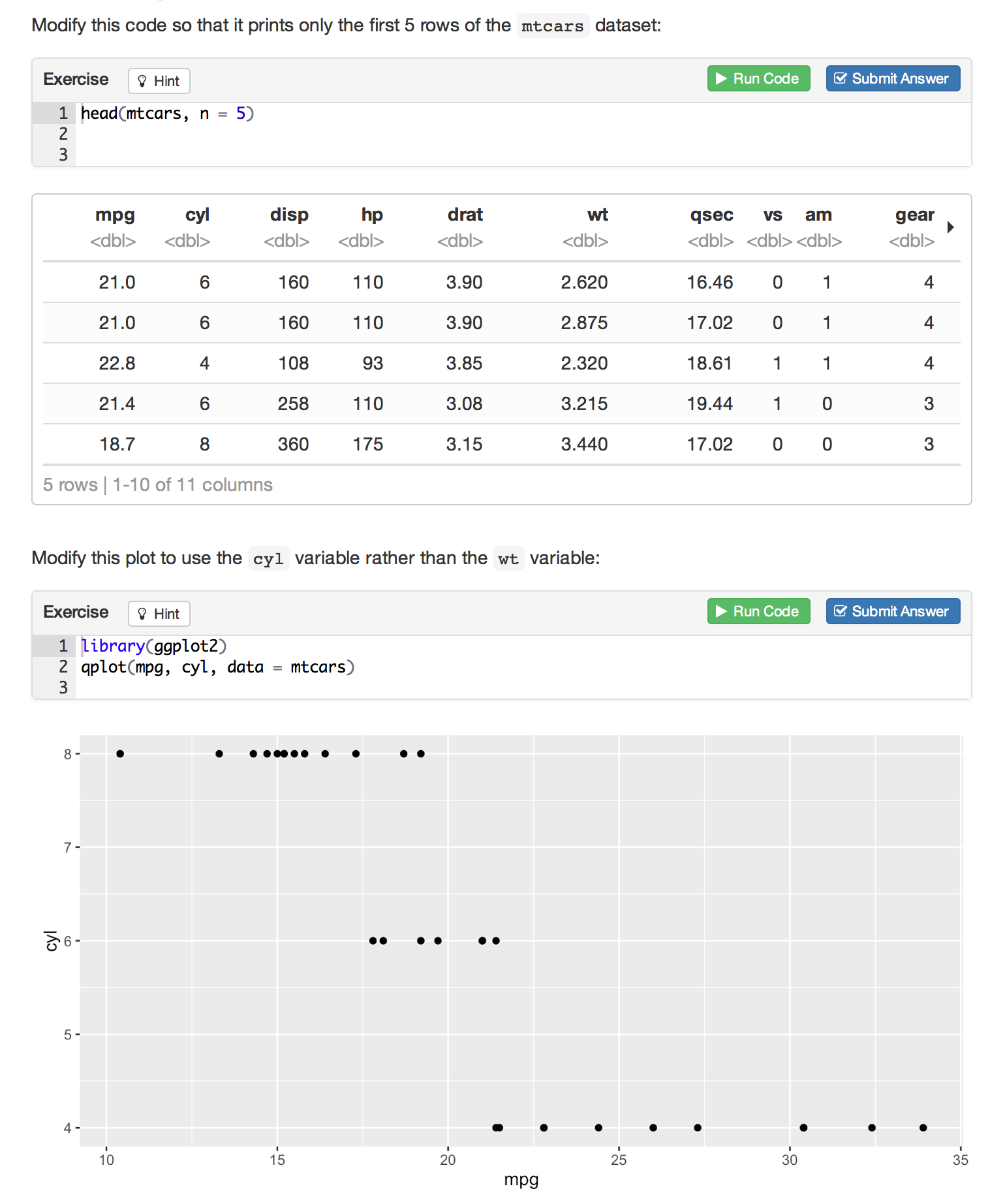 Exercises are interactive R code chunks that allow readers to directly execute R code and see its results: