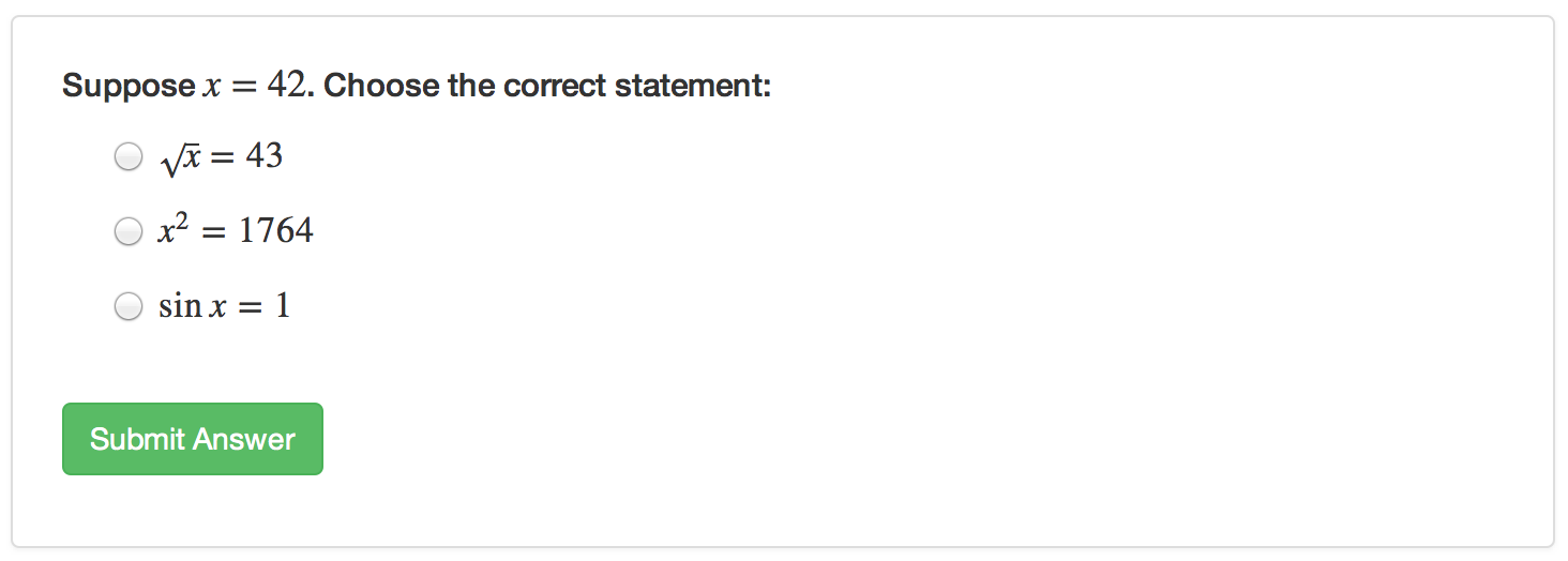 answer(sprintf("$x ^ 2 = %d$", x^2), correct = TRUE),