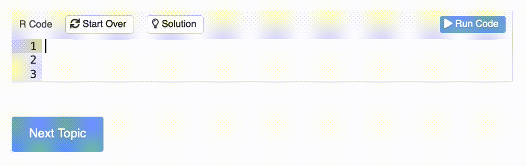 In all of the above cases, the actual R output, often an error message, is always shown to the learner. This helps students acclimate to the error messages they would see in their console if encountered in their every-day usage of R.