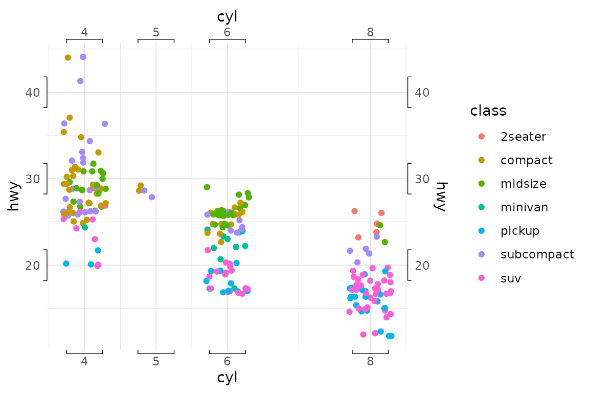 p <- ggplot(mpg, aes(cyl, hwy, colour=class)) +
