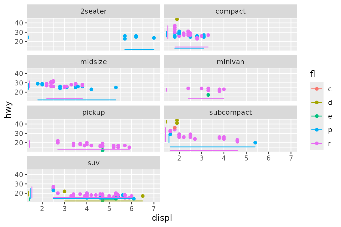 p <- ggplot(mpg, aes(displ, hwy, colour = fl)) +