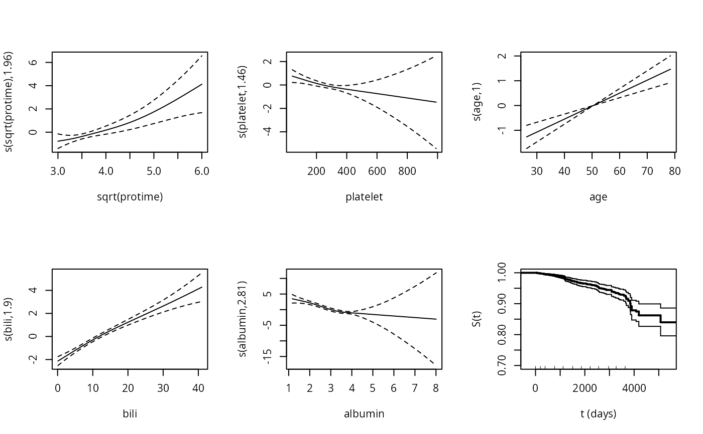 b <- bam(z ~ tf - 1 + sex + trt + s(sqrt(protime)) + s(platelet)+ s(age)+