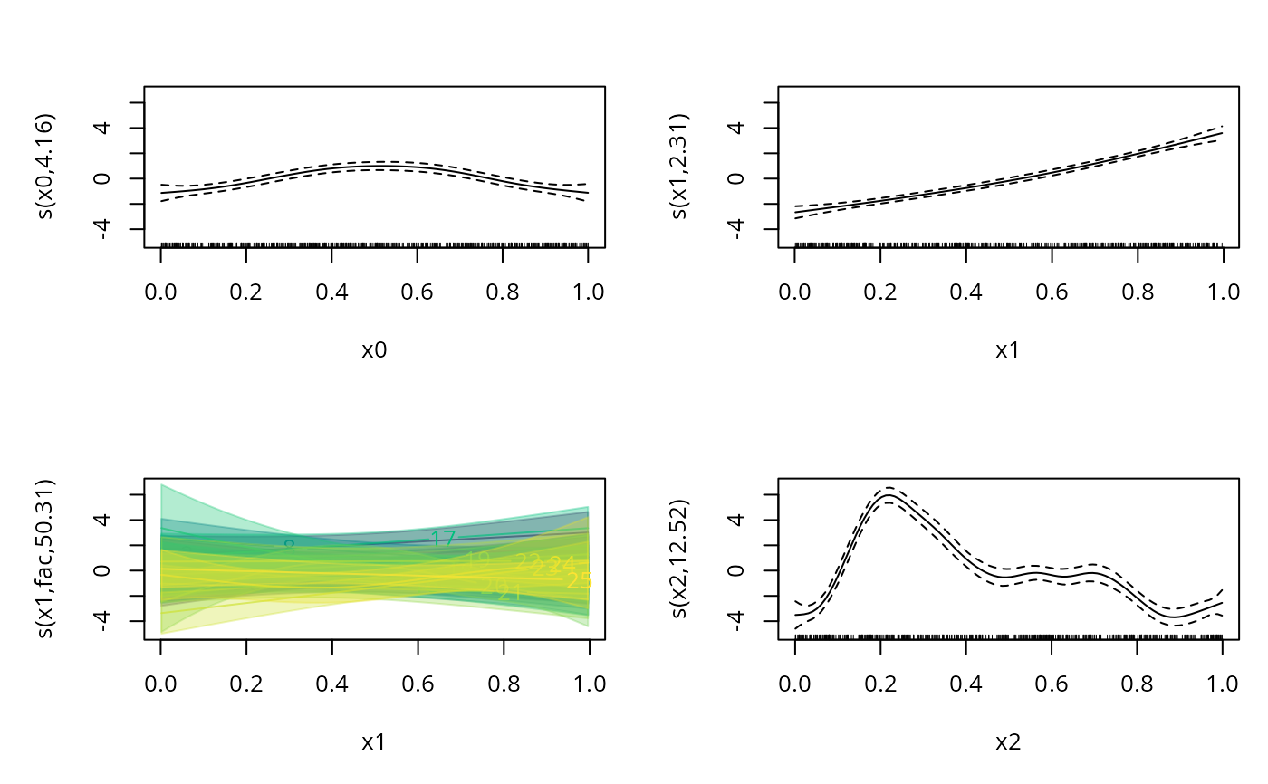 ## b <- gam(y~s(x0)+ s(x1,fac,bs="fs",k=5)+s(x2,k=20),method="ML")