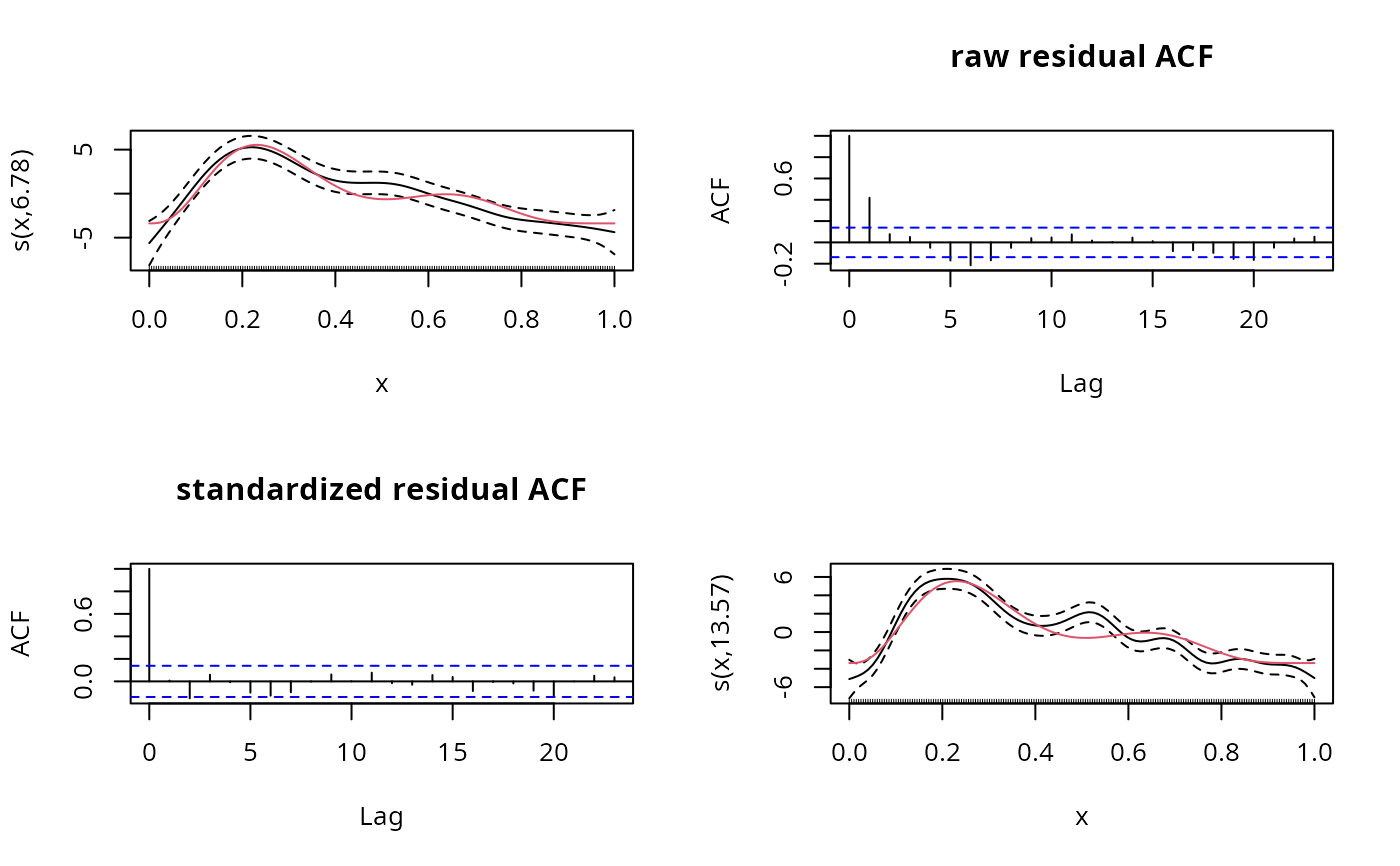 b <- gamm(y~s(x,k=20),correlation=corAR1())
