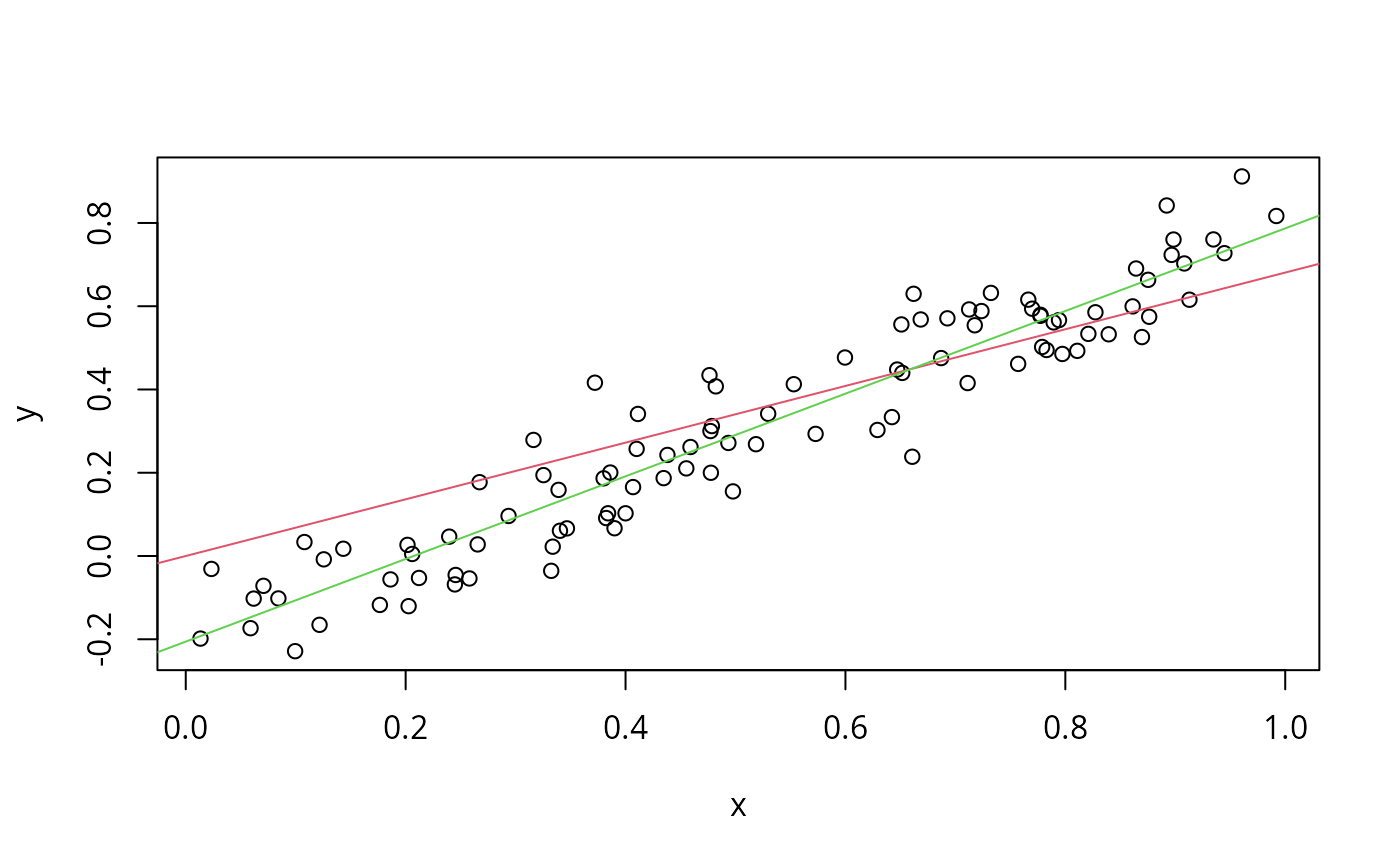 plot(x,y); abline(M$p,col=2); abline(coef(lm(y~x)),col=3)
