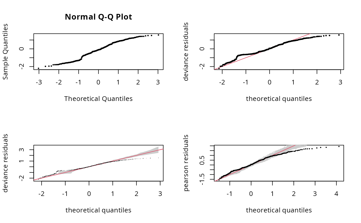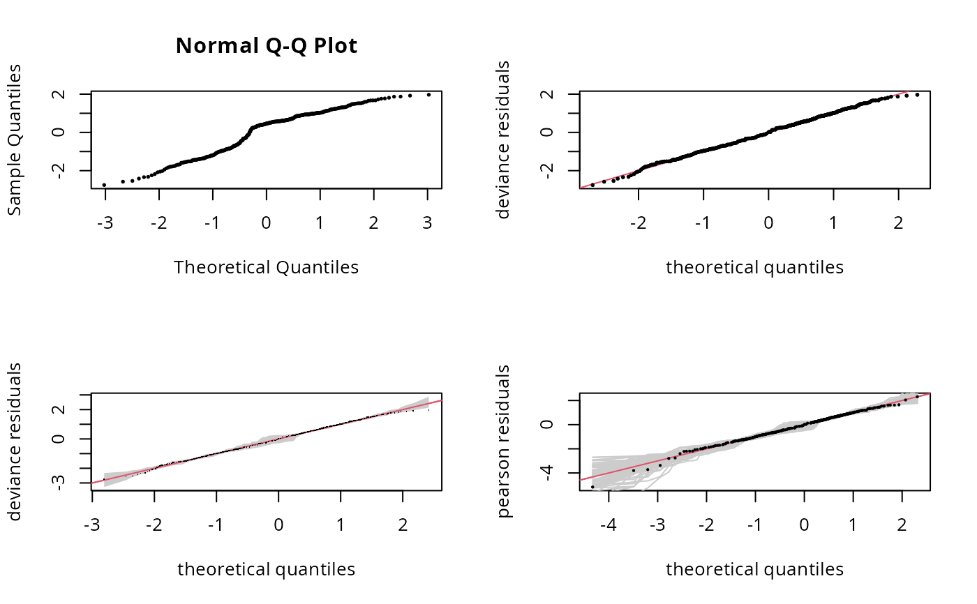 QQ-plots of the the model residuals can be produced in one of two ways. The cheapest method generates reference quantiles by