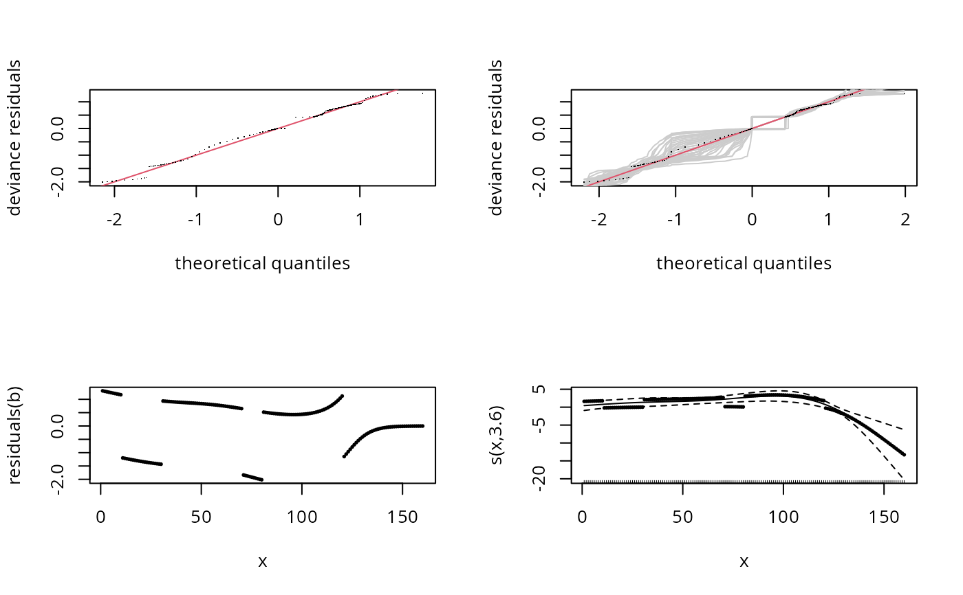 Even if rep is set to zero, the routine will attempt to simulate quantiles if no quantile function is available for the family. If no random deviate generating function family is available (e.g. for the quasi families), then a normal QQ-plot is produced. The routine conditions on the fitted model coefficents and the scale parameter estimate.