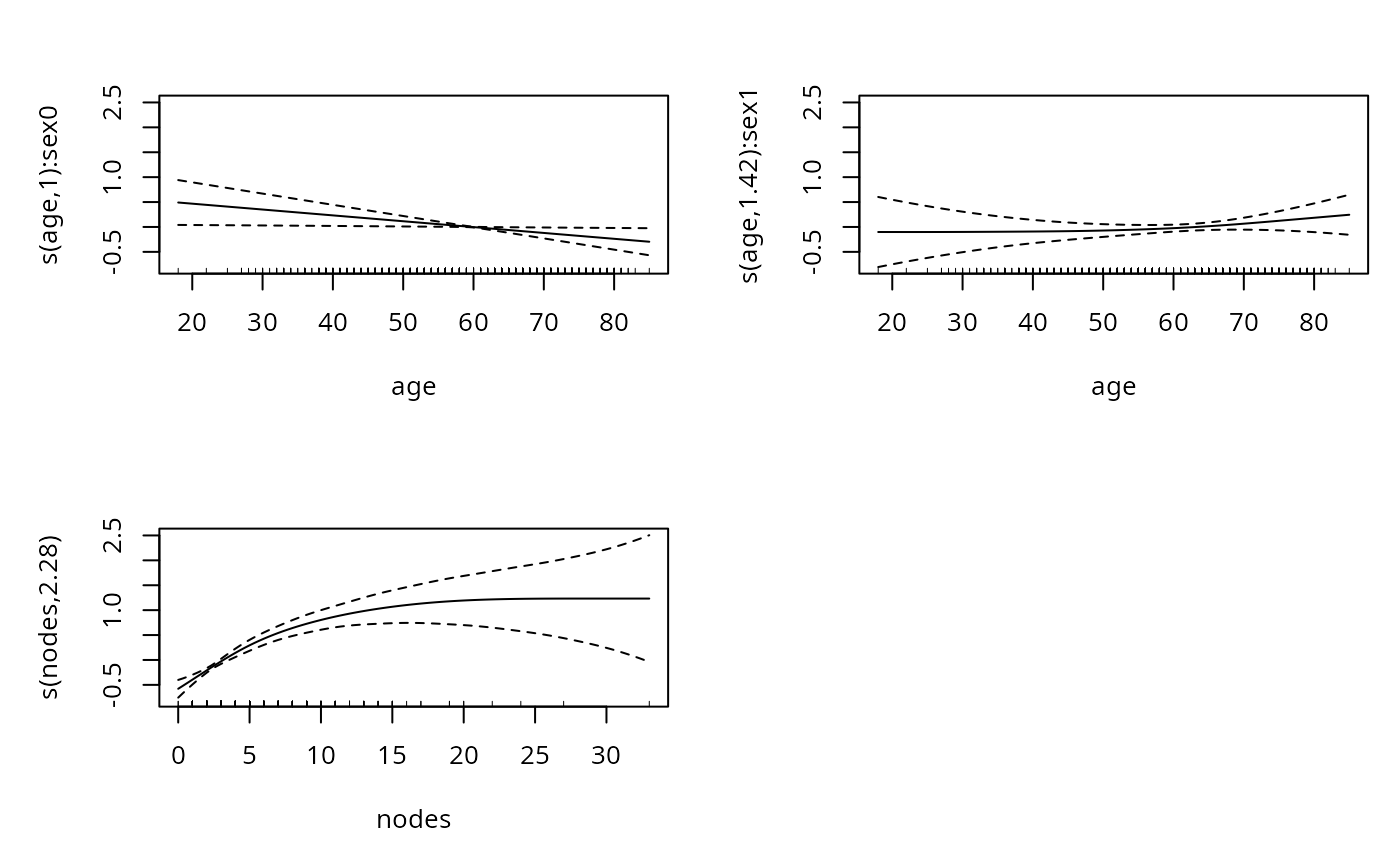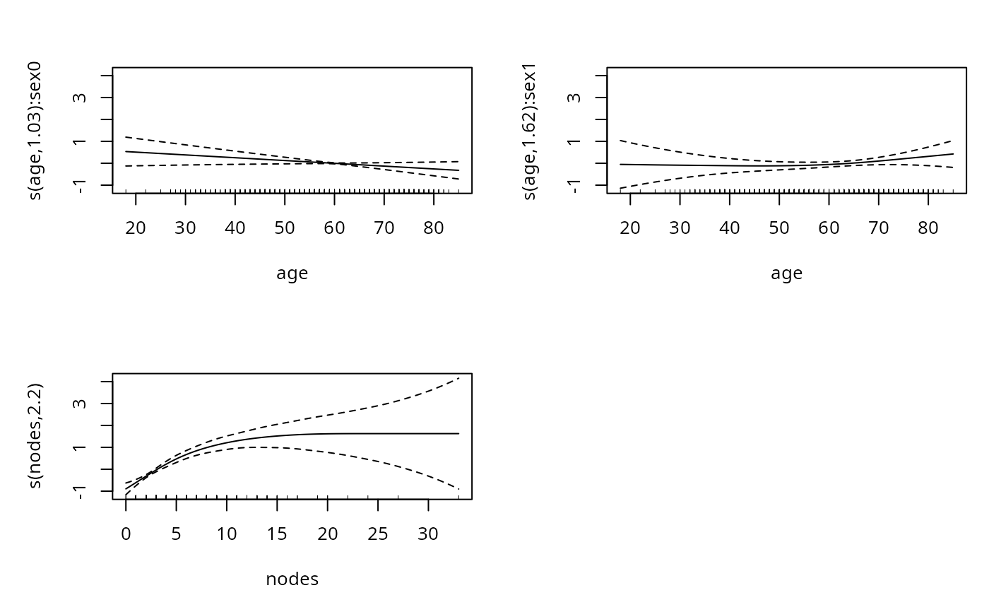 #> logt ~ s(age, by = sex) + sex + s(nodes, bs = "sc", xt = "m+") +