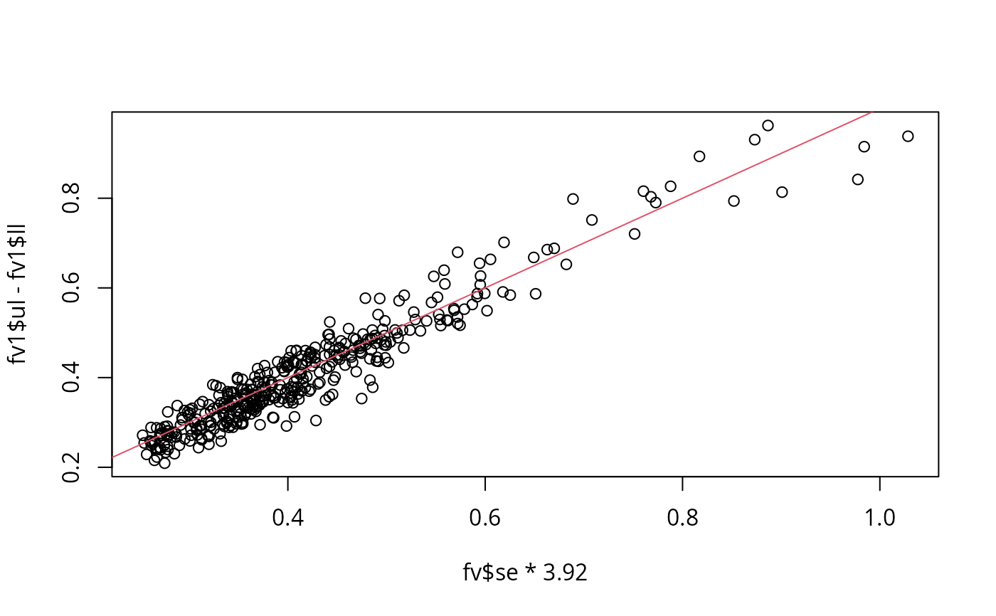 plot(fv$se*3.92,fv1$ul-fv1$ll) ## compare CI widths
