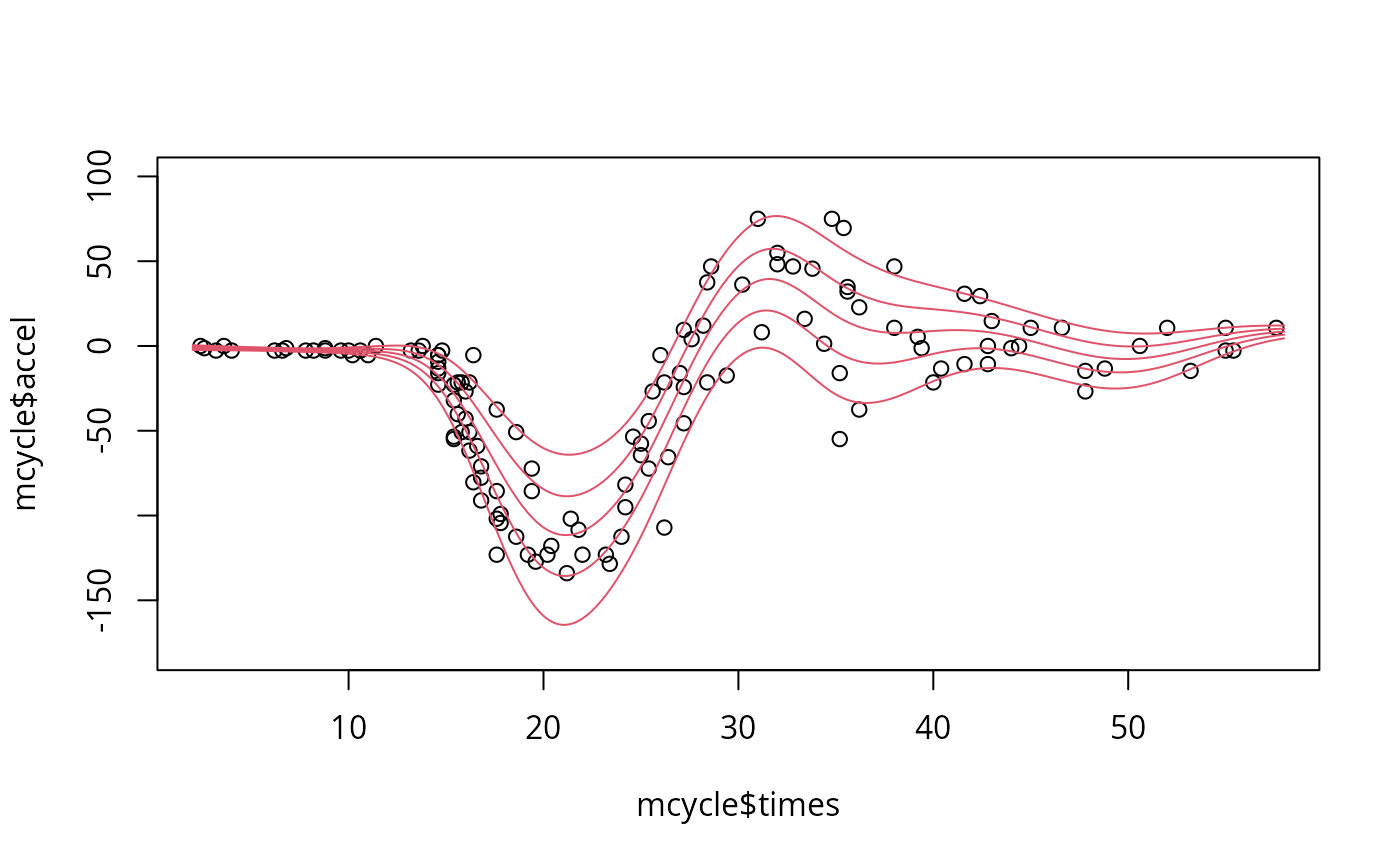 plot(mcycle$times, mcycle$accel, ylim = c(-180, 100))