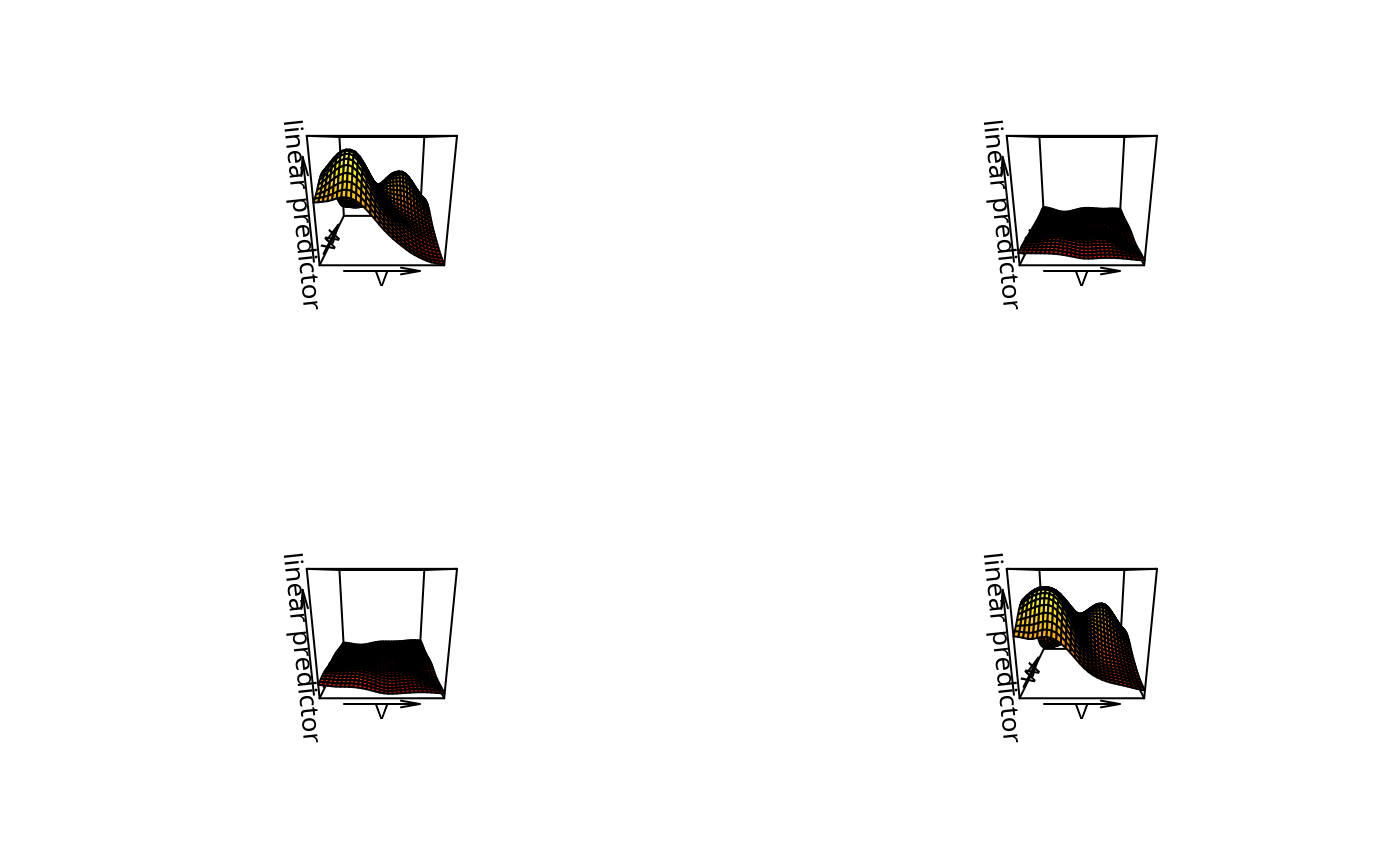 The re-parameterized marginal bases are then combined to produce a basis for a single function of all the covariates (dimension given by the product of the dimensions of the marginal bases). In this set up there are multiple penalty matrices — all zero, but for a mixture of a constant and zeros on the leading diagonal. No two penalties have a non-zero entry in the same place.