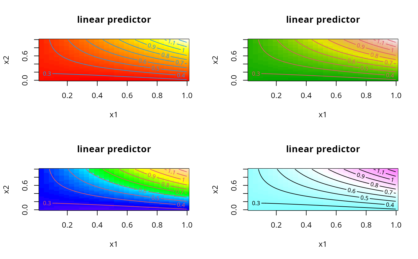 vis.gam(g, view=c("x1","x2"),plot.type="contour",color="terrain")
