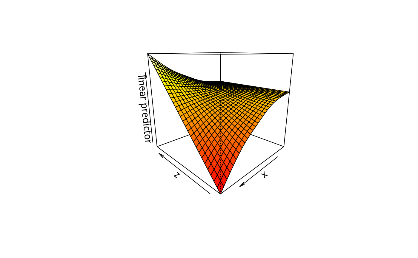 vis.gam(b,view=c("z","x"),theta= -135) # plot against by variable