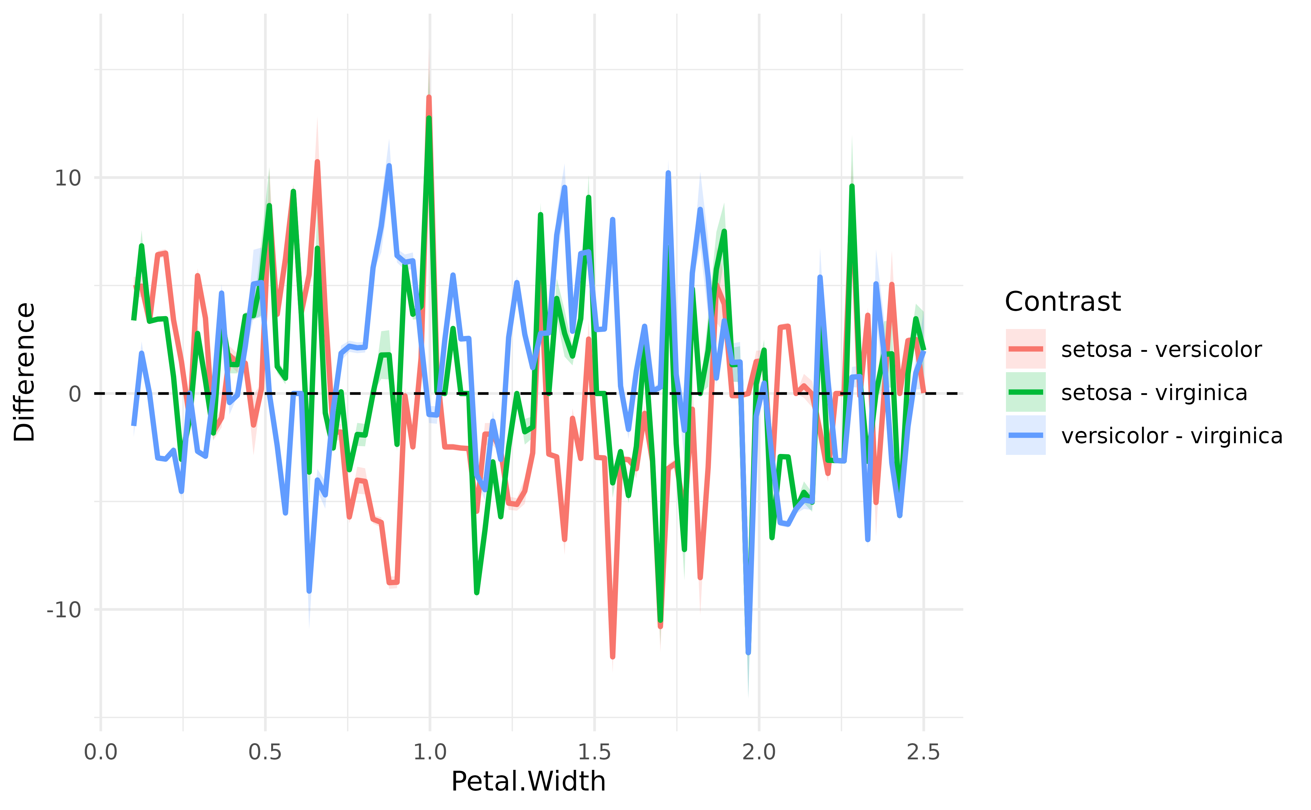 contrasts at 100 equally-spaced points of Petal.Width, that