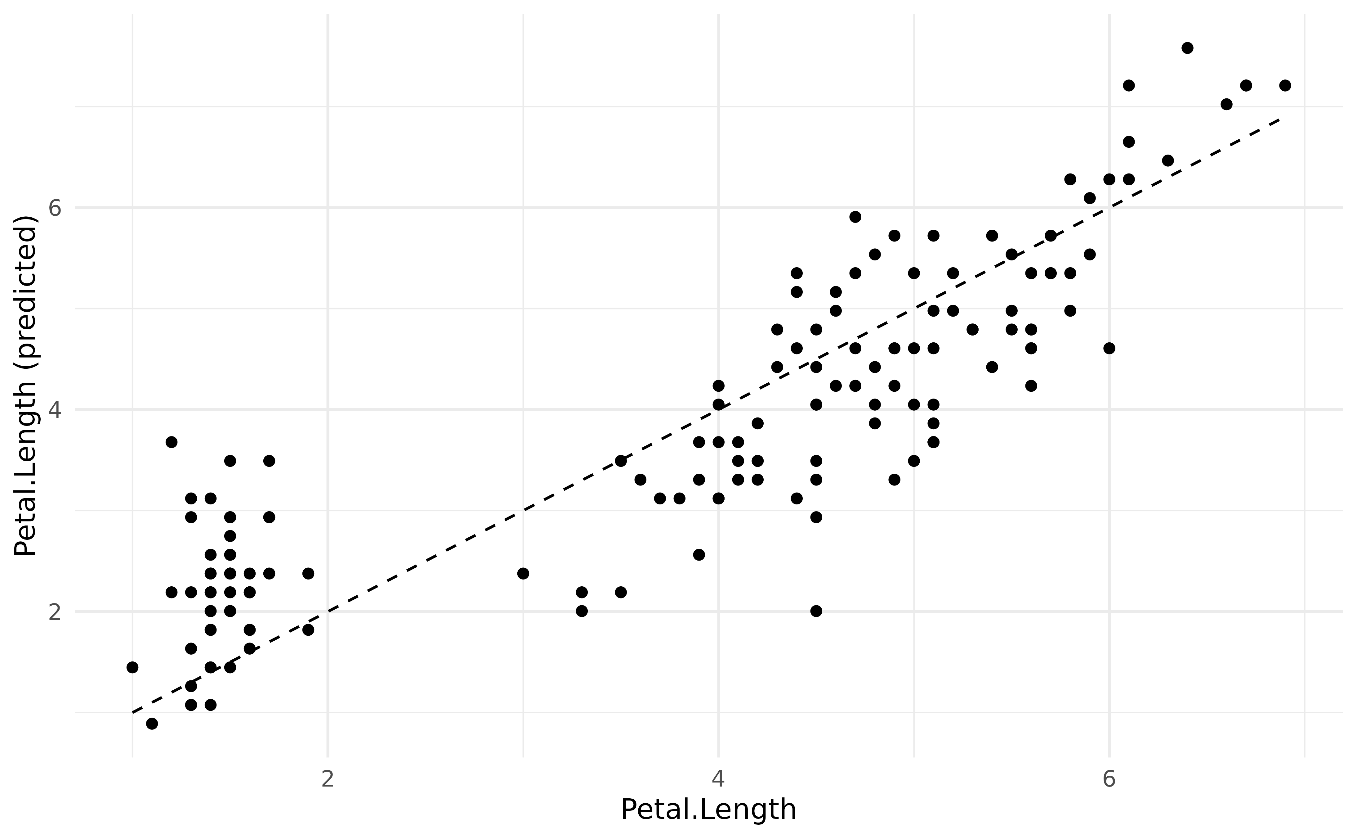 geom_line(aes(x = Petal.Length, y = Petal.Length), linetype = "dashed") +