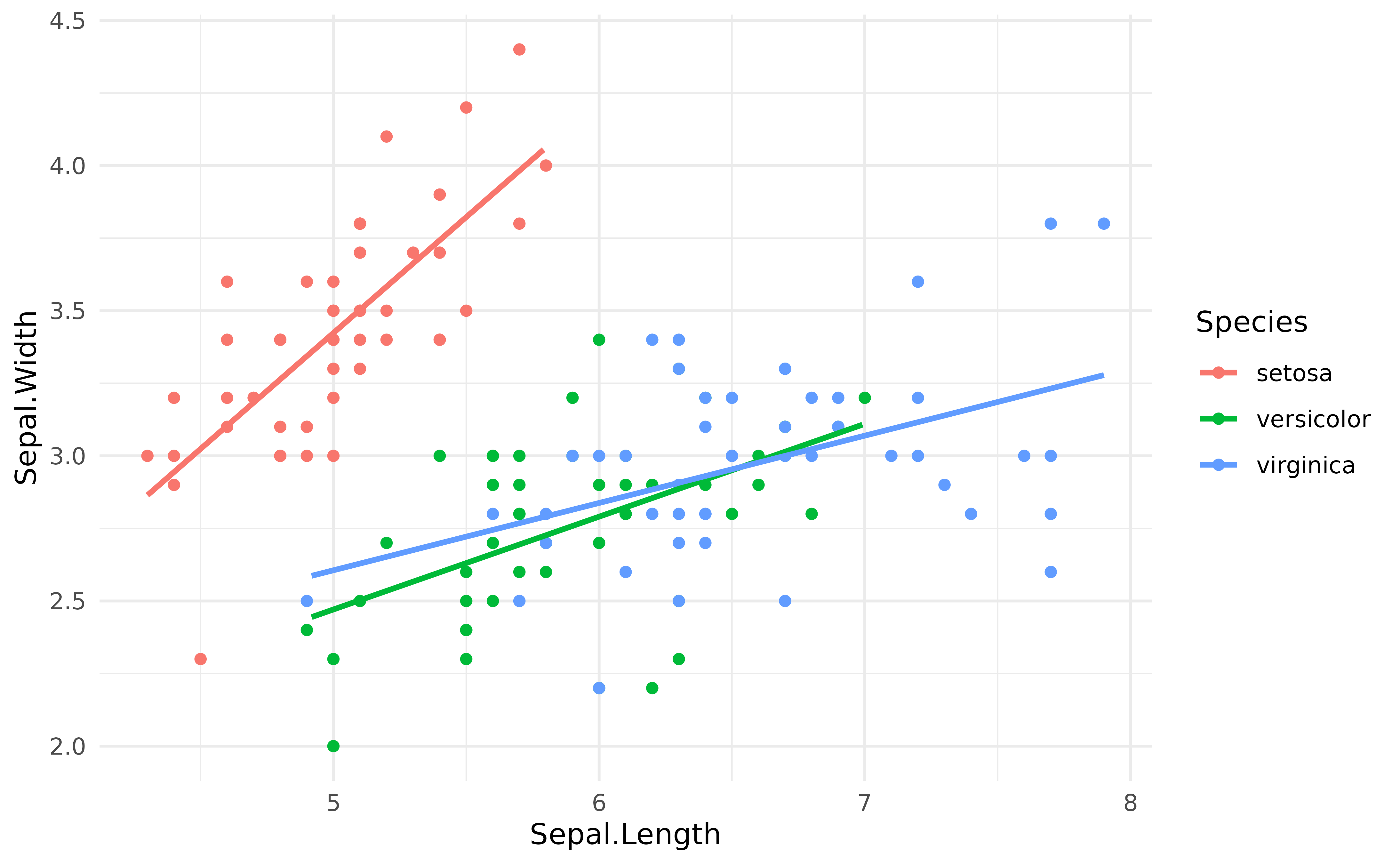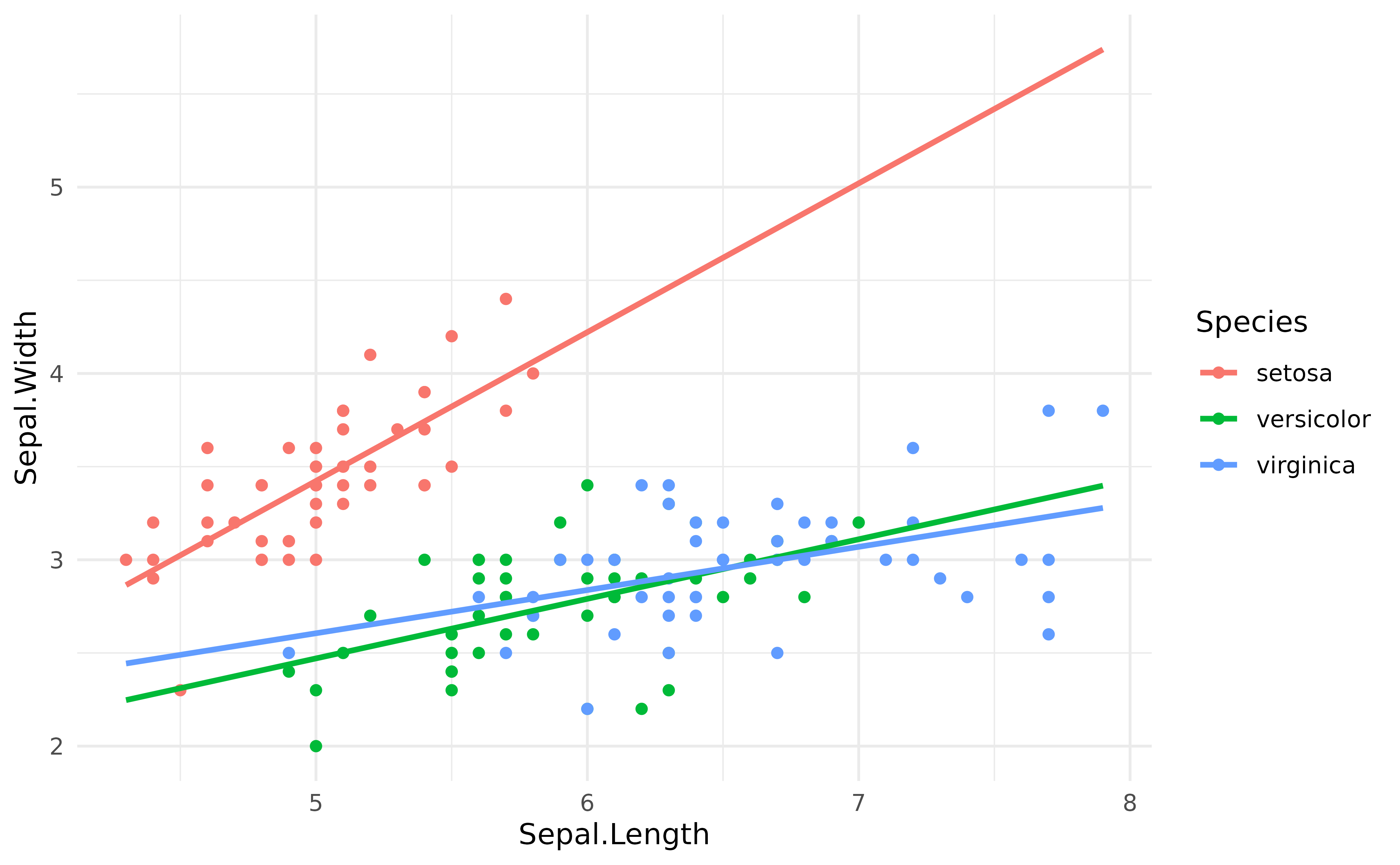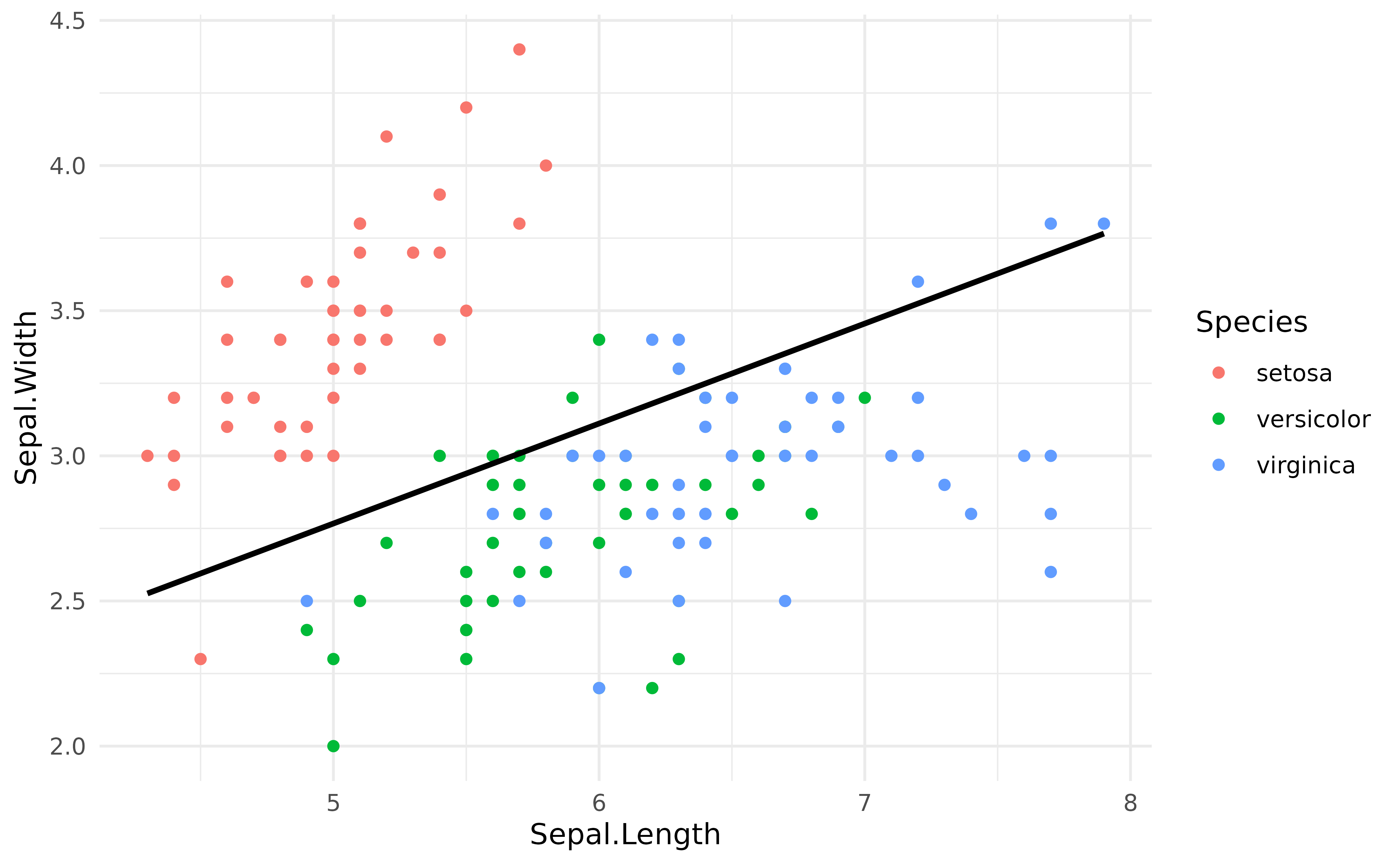As we can see, when adjusting for the species, the relationship between the two variables has become positive!