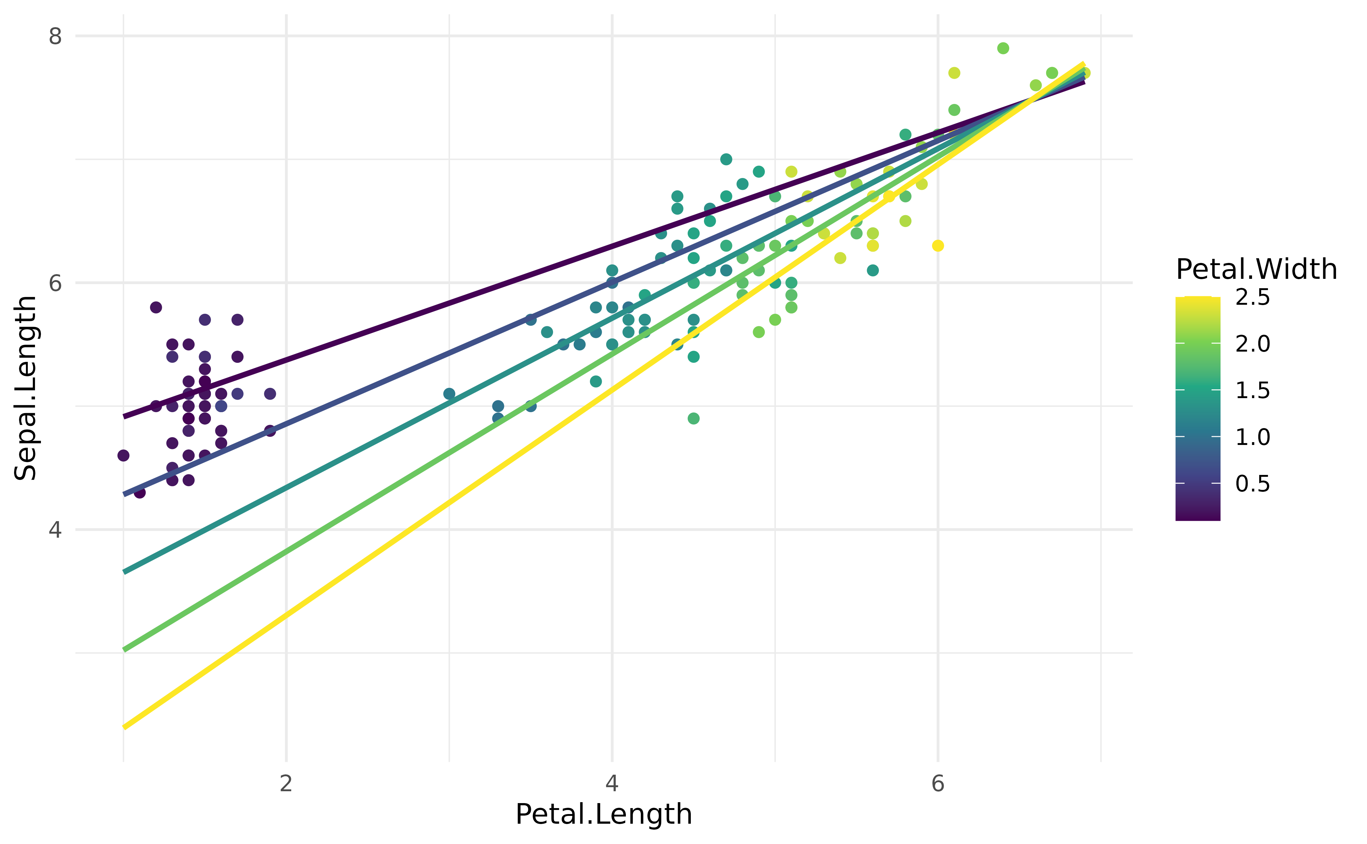 geom_line(data = vizdata, aes(y = Predicted, color = Petal.Width), linewidth = 1) +