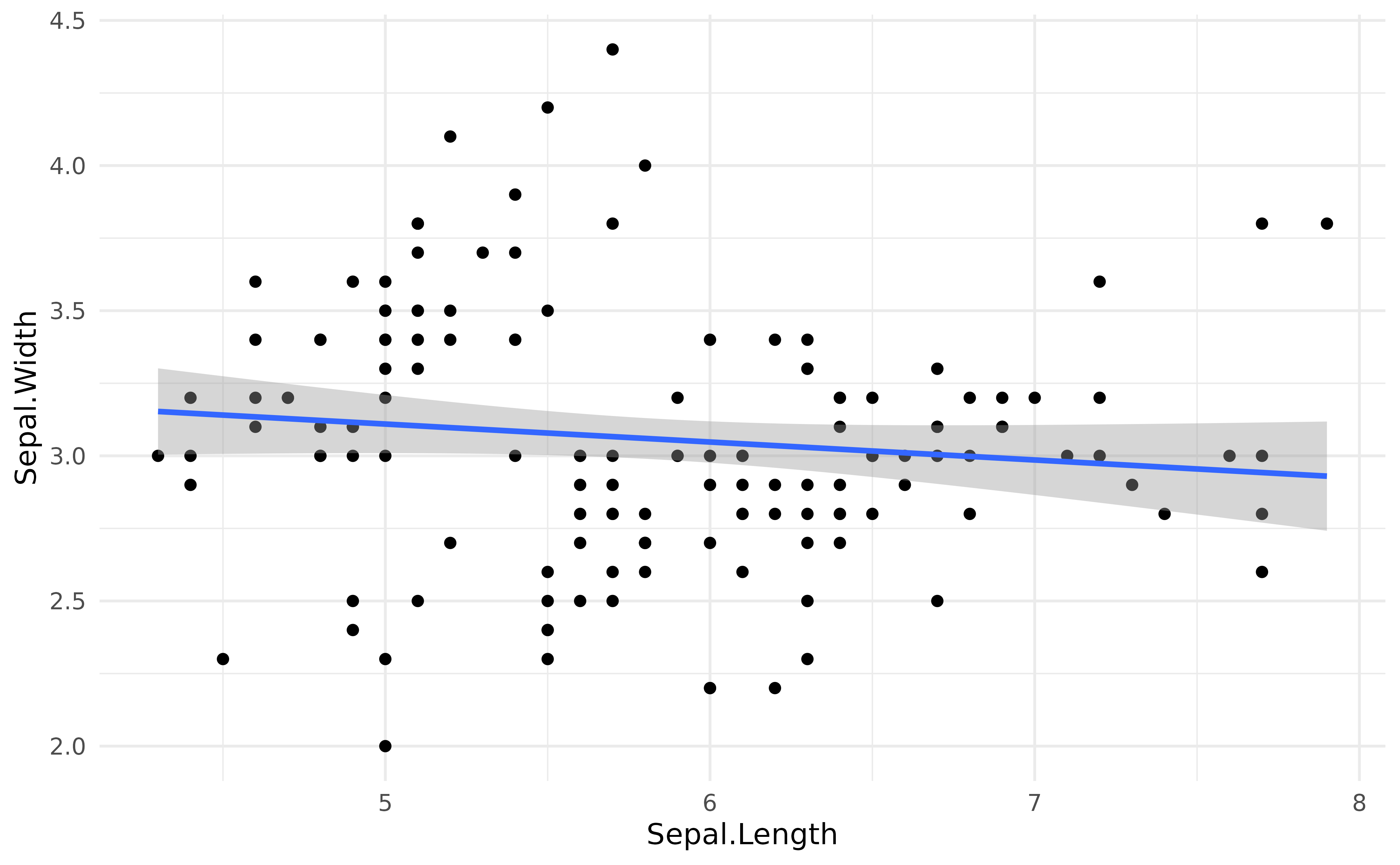 ggplot(iris, aes(x = Sepal.Length, y = Sepal.Width)) +