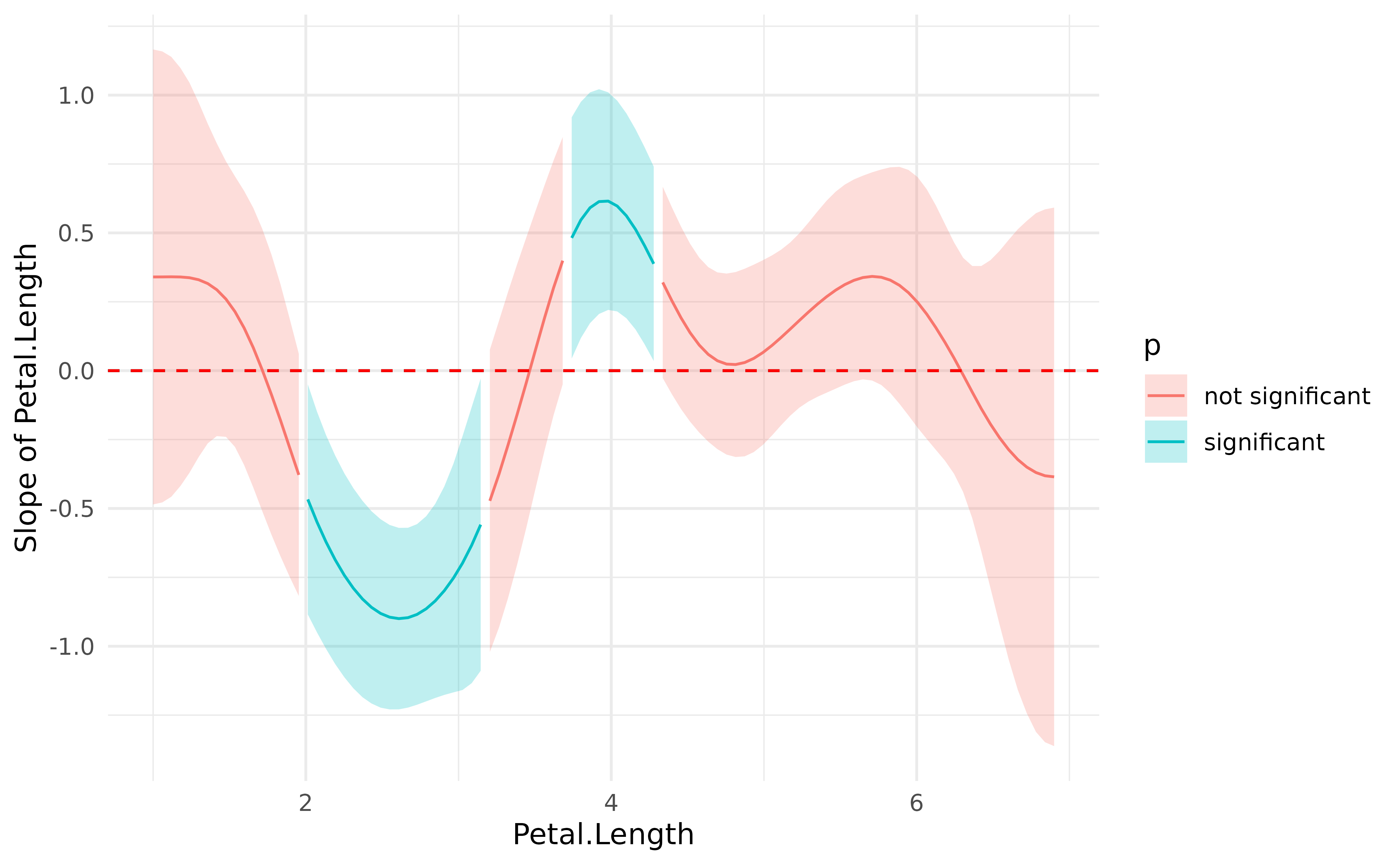 This plot represents the “slope” of the curve at each point of the curve. As you can see, there is a significant negative trend (after Petal.Length = 2), followed by a significant positive trend (around Petal.Length = 4). Marginal derivatives allow us to make inferences at each point of the relationship!