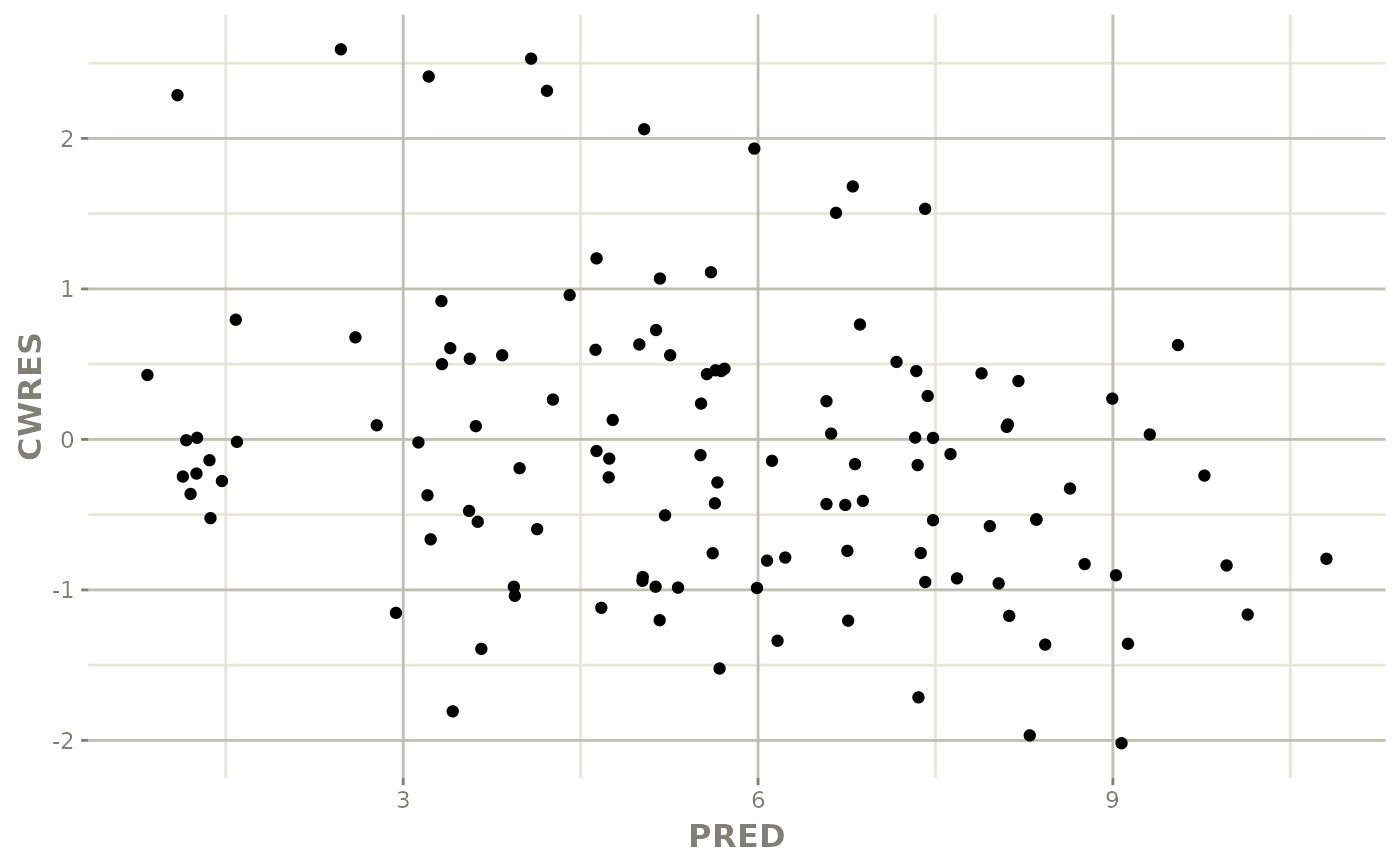ggplot(fit, aes(PRED, CWRES)) +