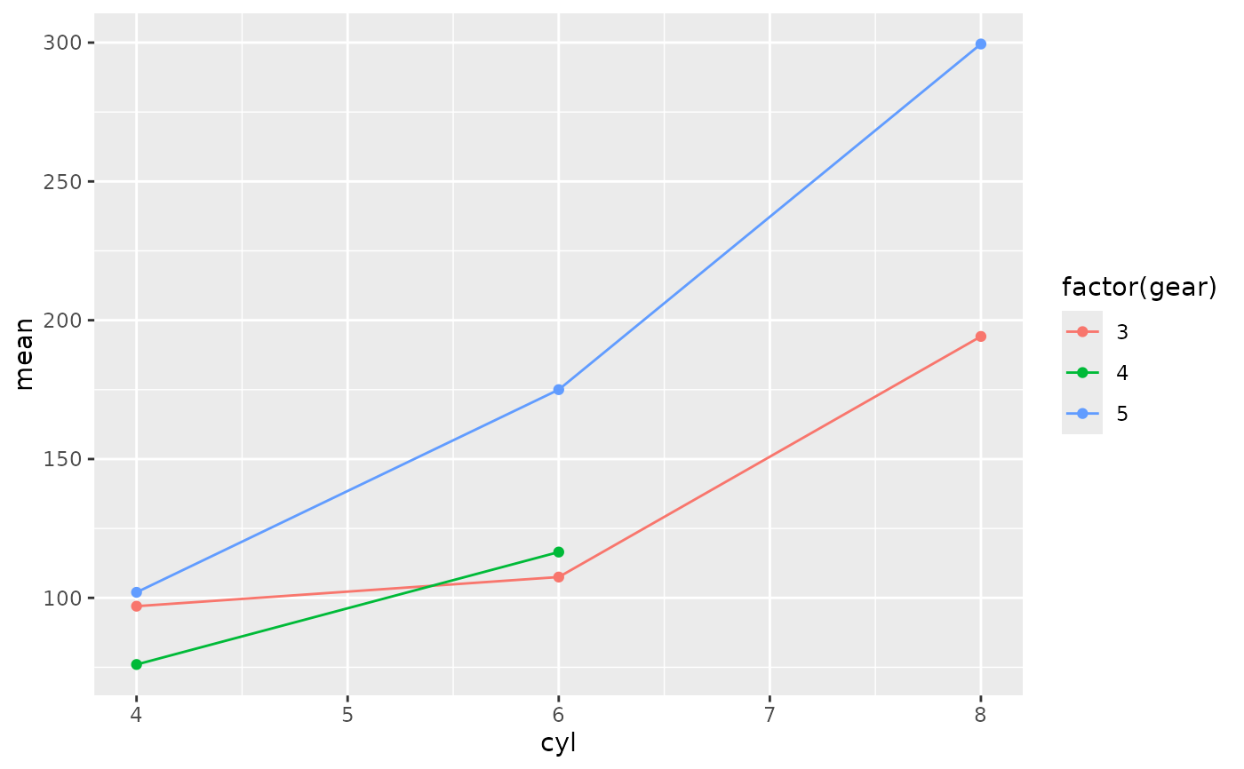 gf_point(mean ~ cyl, color = ~ factor(gear)) |>