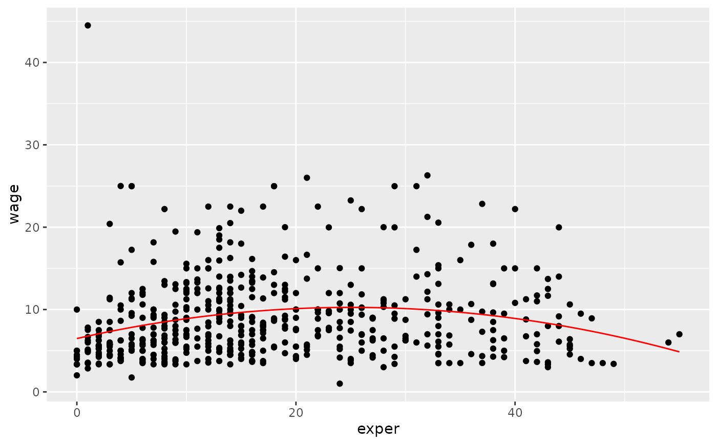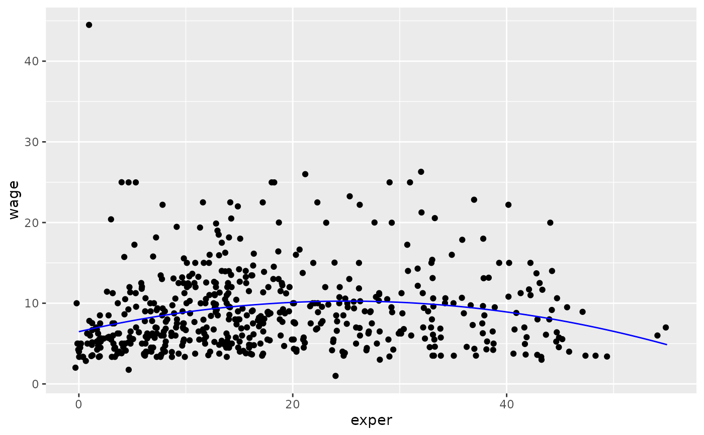 model <- lm(wage ~ poly(exper, degree = 2), data = CPS85)