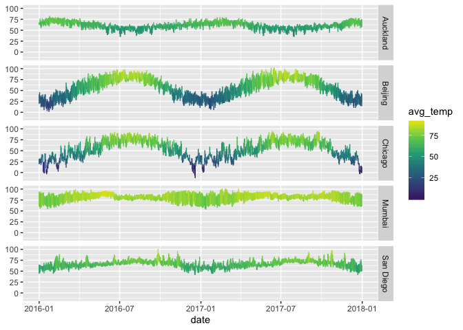 gf_linerange(high_temp + low_temp ~ date | city ~ ., color = ~avg_temp, data = Weather) |>