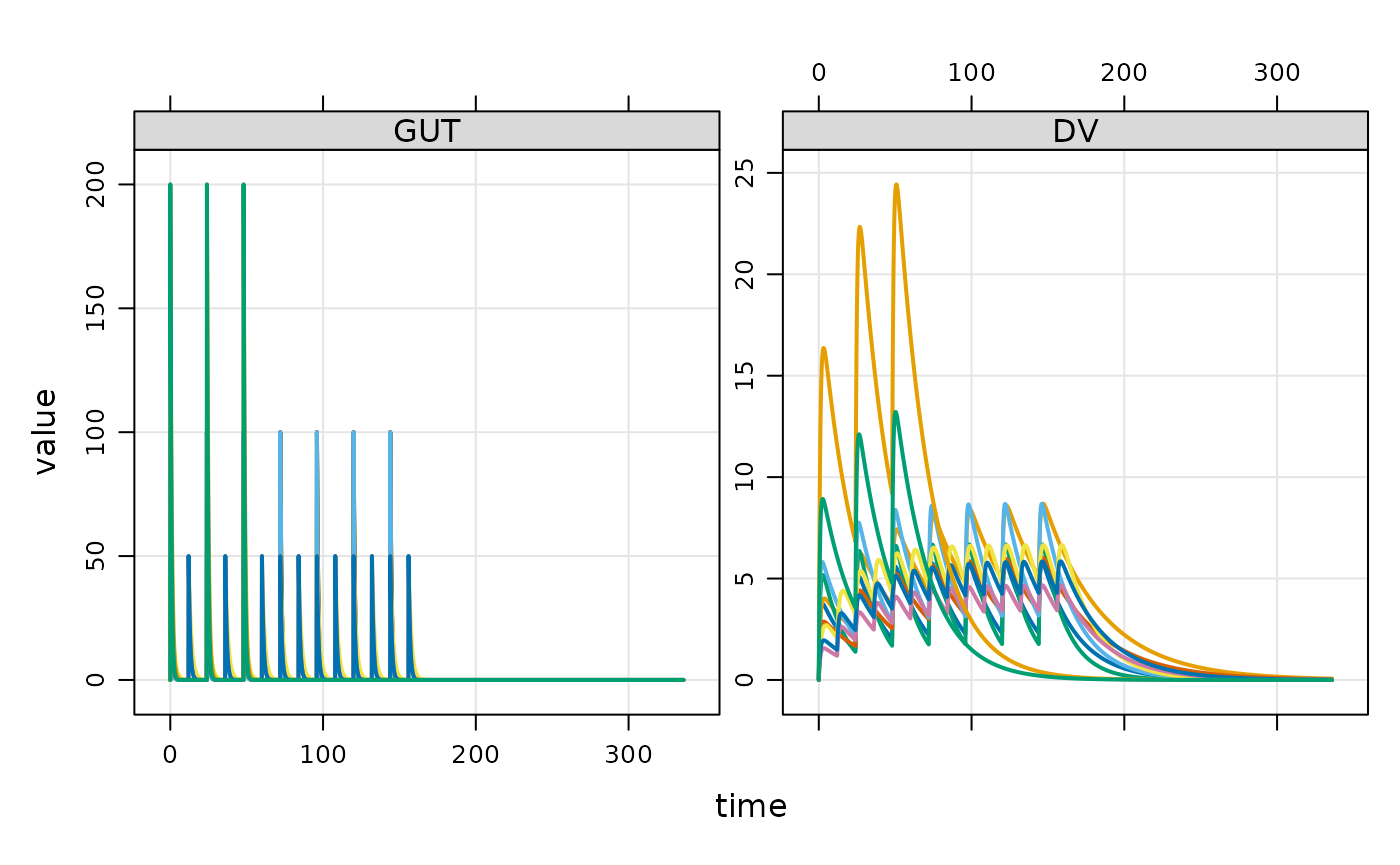 We can implement this series of doses by passing e in as the events argument to mrgsim