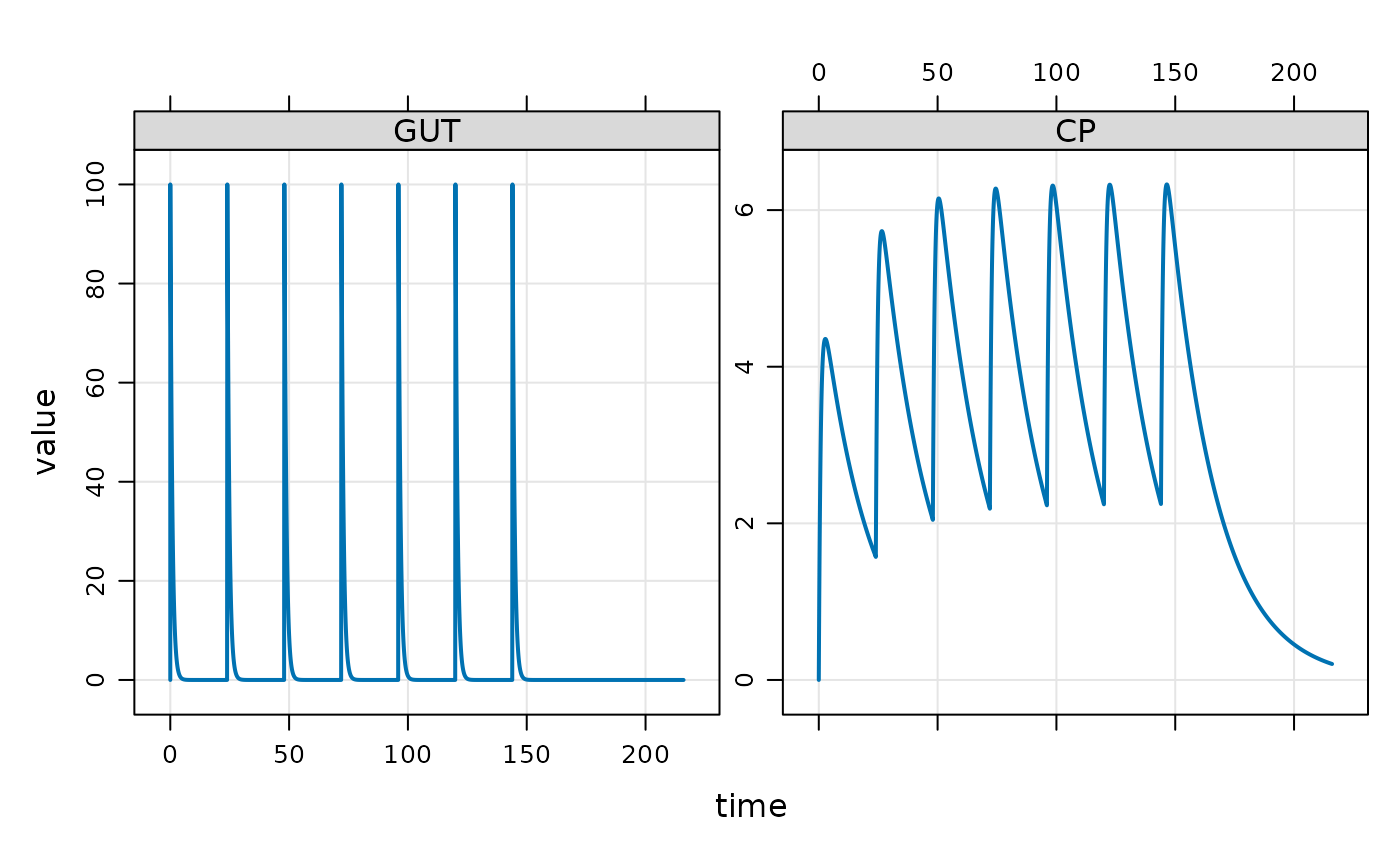 e <- ev(amt = 100, ii = 24, addl = 6)This will implement 100 unit doses every 24 hours for a total of 7 doses. e has class ev, but really it is just a data frame