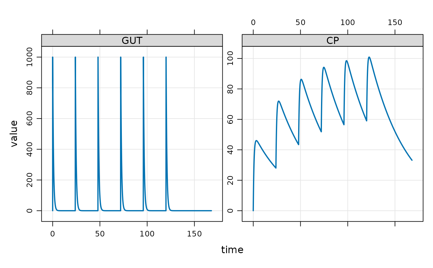 out <- mod %>% ev(events) %>% mrgsim(end=168)