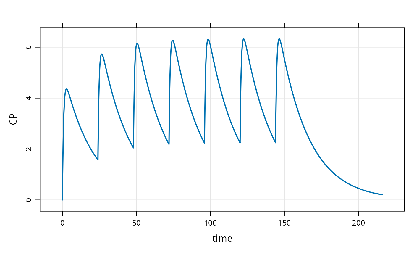 e <- ev(amt = 100, ii = 24, addl = 6)This will implement 100 unit doses every 24 hours for a total of 7
