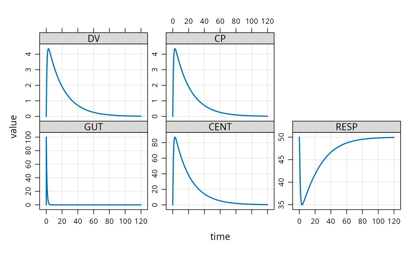 mod %>% ev(amt = 100) %>% mrgsim() %>% plot()