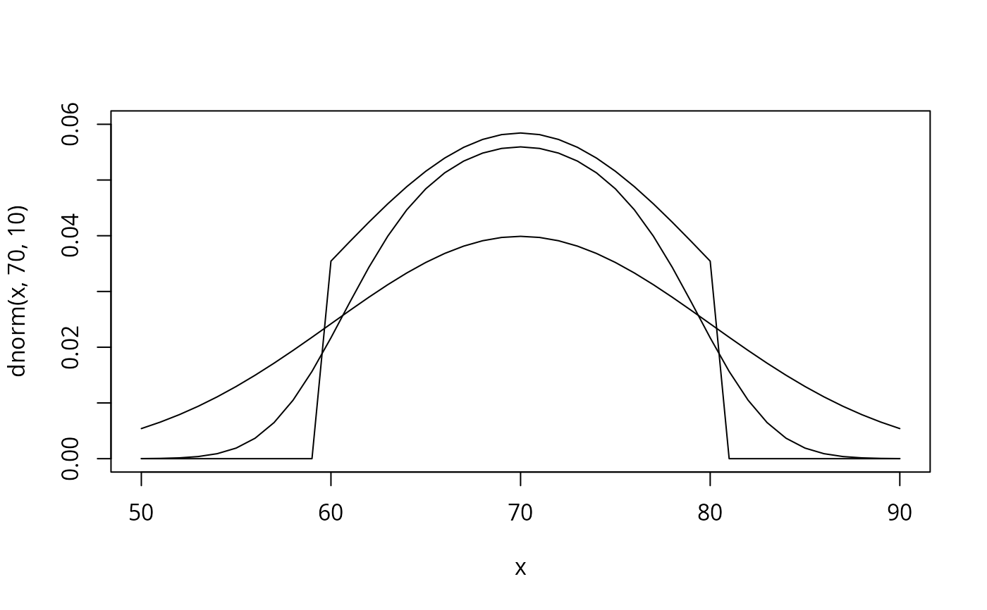 lines(x, dmenorm(x, 70, 10, 60, 80, sderr=3), type="l")