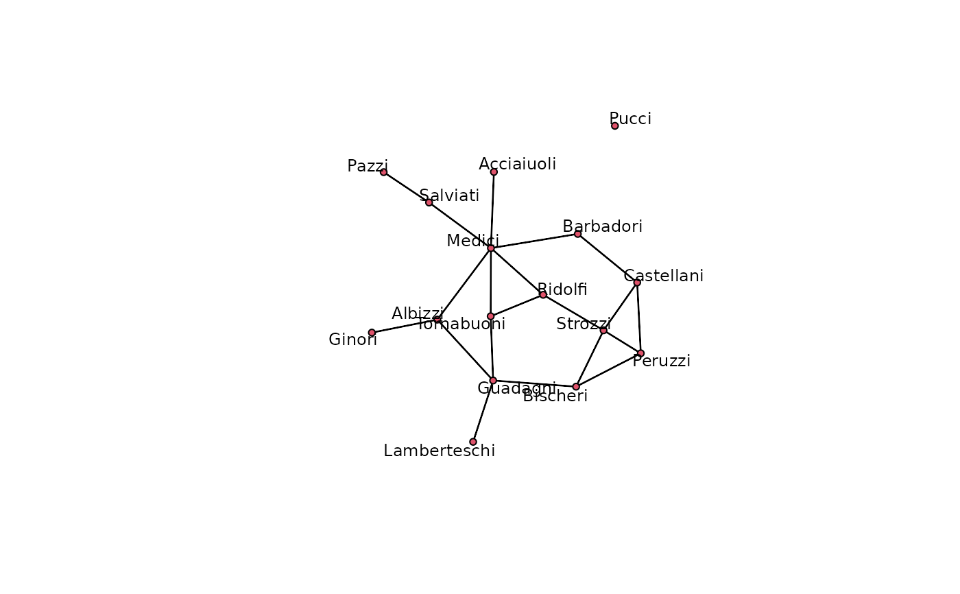 data(flo)Padgett, John F. (1994). “Marriage and Elite Structure in Renaissance Florence, 1282-1500.” Paper delivered to the Social Science History Association.