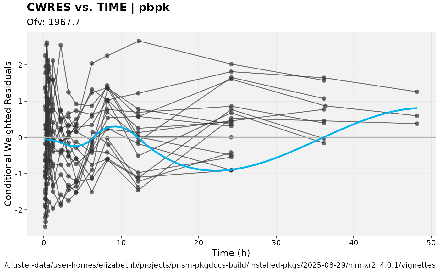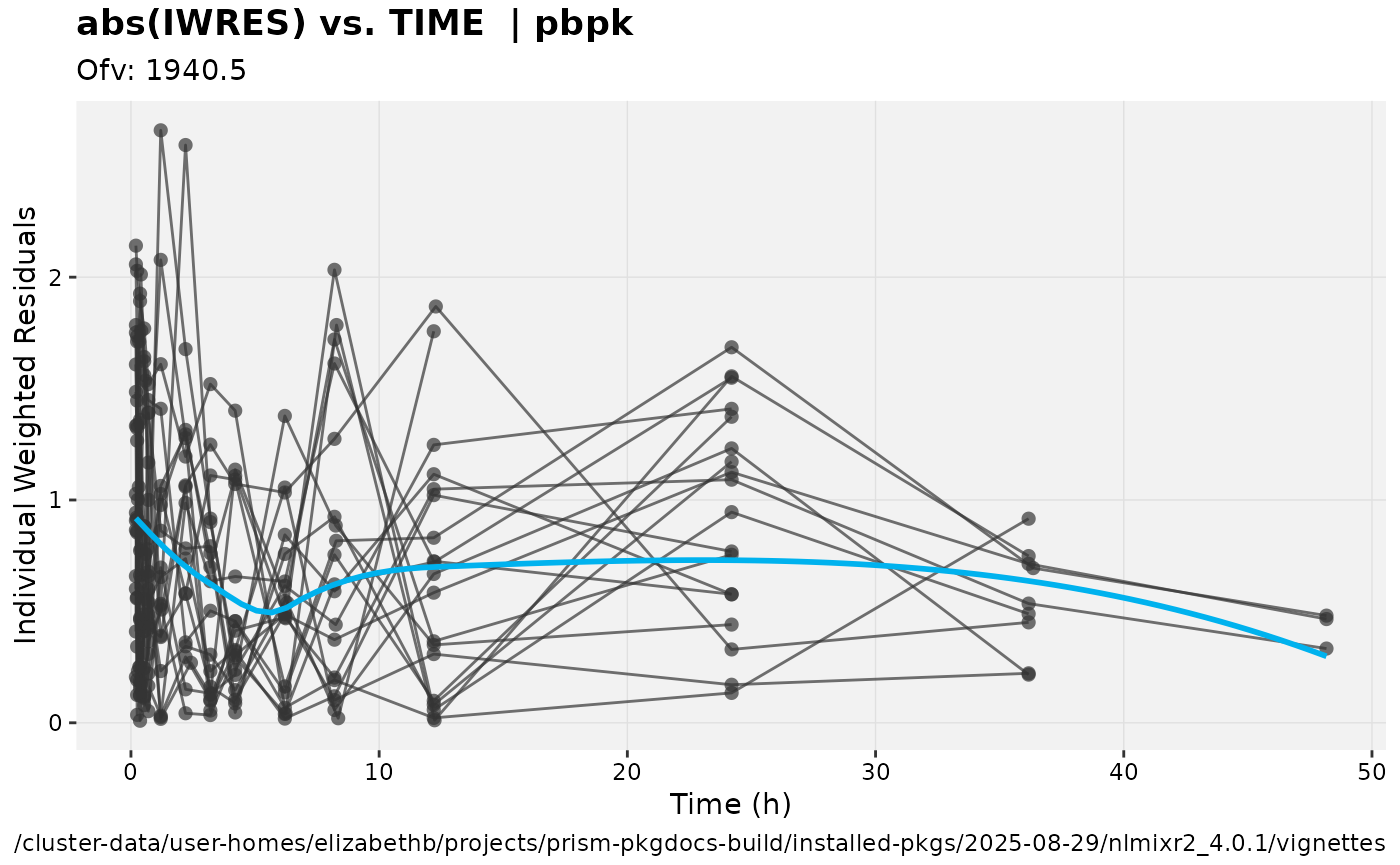 table=list(npde=TRUE, cwres=TRUE))NOTE: the estimates are the same but the AIC is different since it is calculated on the log scale.