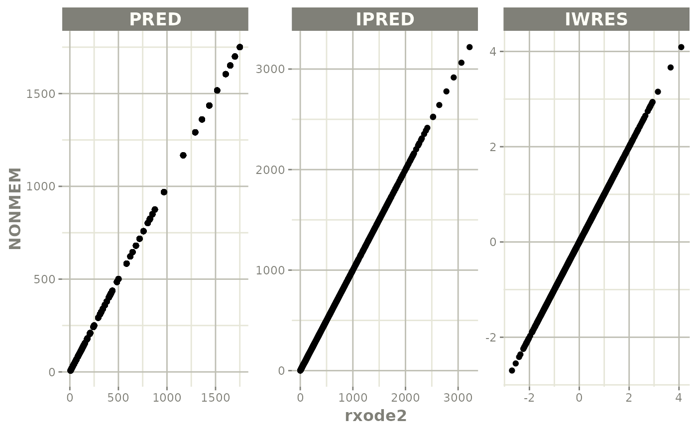 #> 6 1 2.00 1435.7 1435.723In these cases you can see that NONMEM seems to round the values for