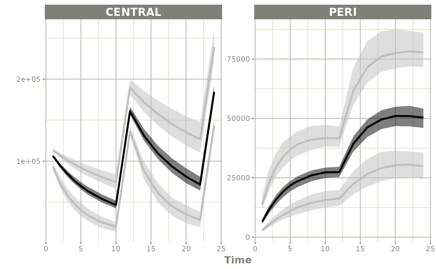 #> # iwres <dbl>, y <dbl>, CENTRAL <dbl>, PERI <dbl>, DV <dbl>Since there is a bunch of data, a confidence band of the simulation with uncertainty would be helpful.
